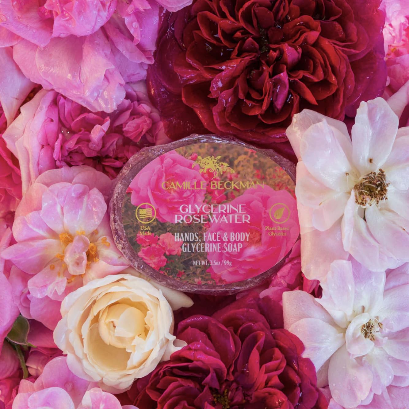 Camille Beckman Essentials Gift Basket, Glycerine Rosewater, Glycerine Hand Therapy 6 oz, Silky Body Cream 13 oz, Hand and Shower Cleansing Gel 13 oz, Glycerine Soap 3.5 oz