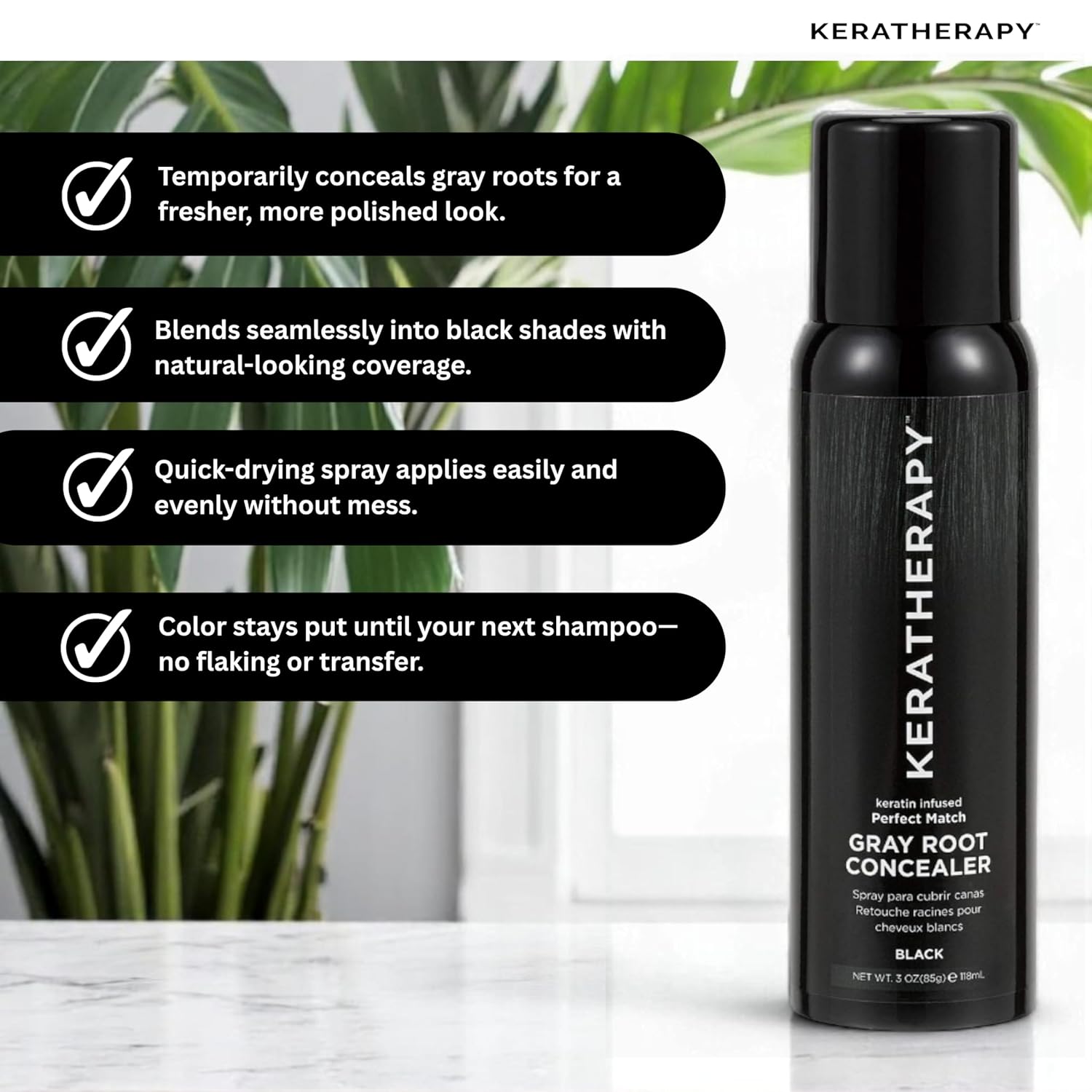 - Gray Root Coverage - Keratherapy Perfect Match Gray Root Concealer is specially formulated to temporarily cover gray roots in your hair with an easy spray-on application; This spray lasts until your next shampoo application