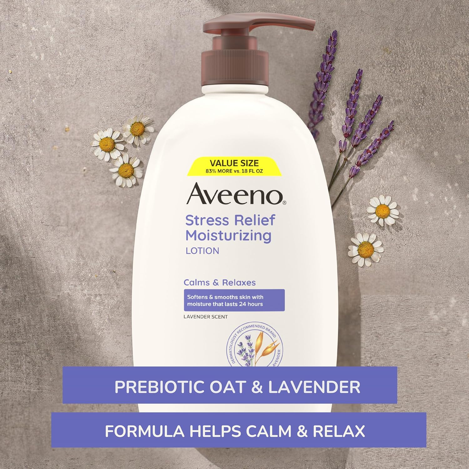 Aveeno Stress Relief Moisturizing Body Lotion 33 Fl Oz, Lavender Scent with Prebiotic Oat, Hydrating 24-Hour Moisturizer Non-Greasy for Dry Sensitive Skin, Paraben & Dye Free, Calming & Relaxing