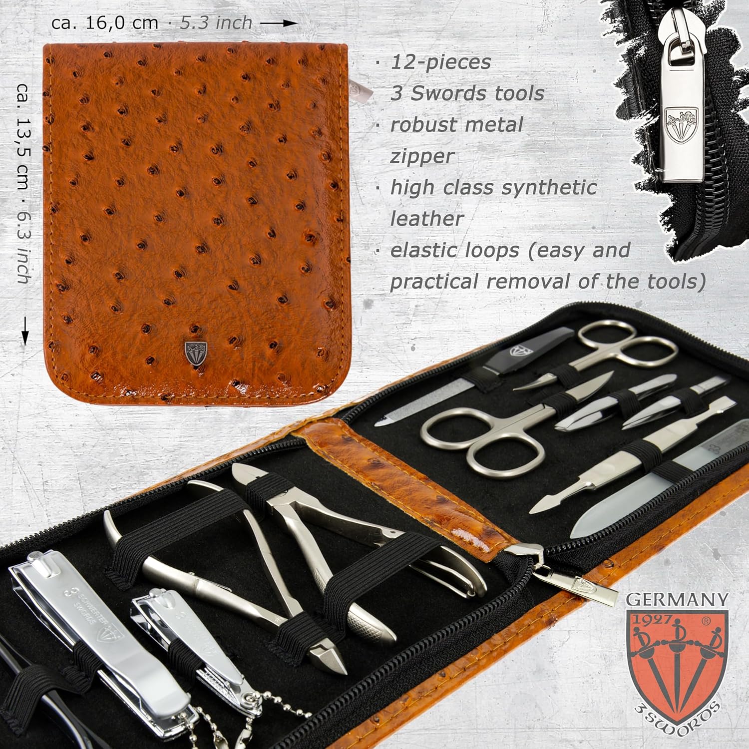3 Swords Germany - brand quality 12 piece manicure pedicure grooming kit set for professional finger & toe nail care with cognac synthetic leather case - Made in Germany