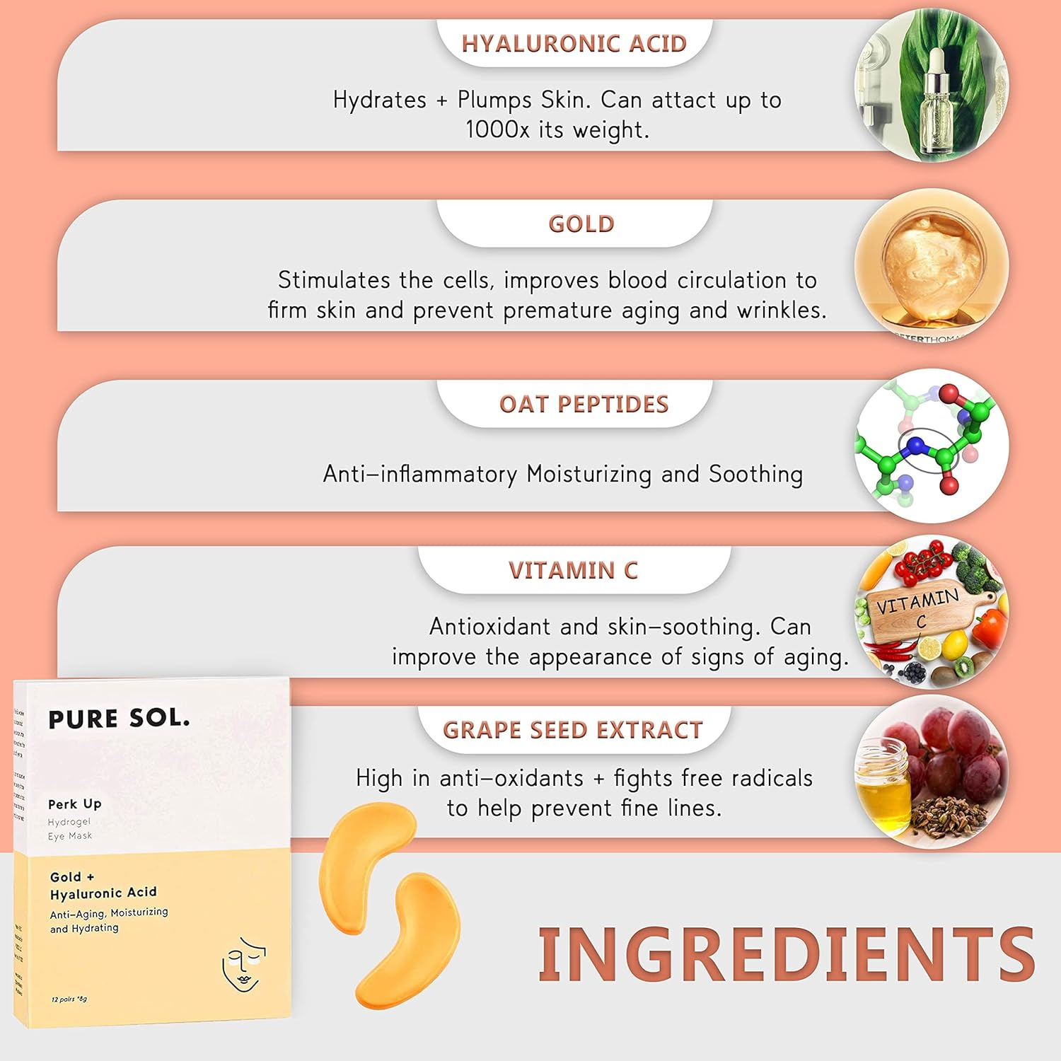 - β STAYS IN PLACE: You are busy and that is why we formulated Pure Sol collagen under eye gel patches to not slip. Leave eye gel pads in the fridge for an extra cooling and depuffing. Keep a couple eye masks in your bag for when you need a pick me up on the airplane or car ride.