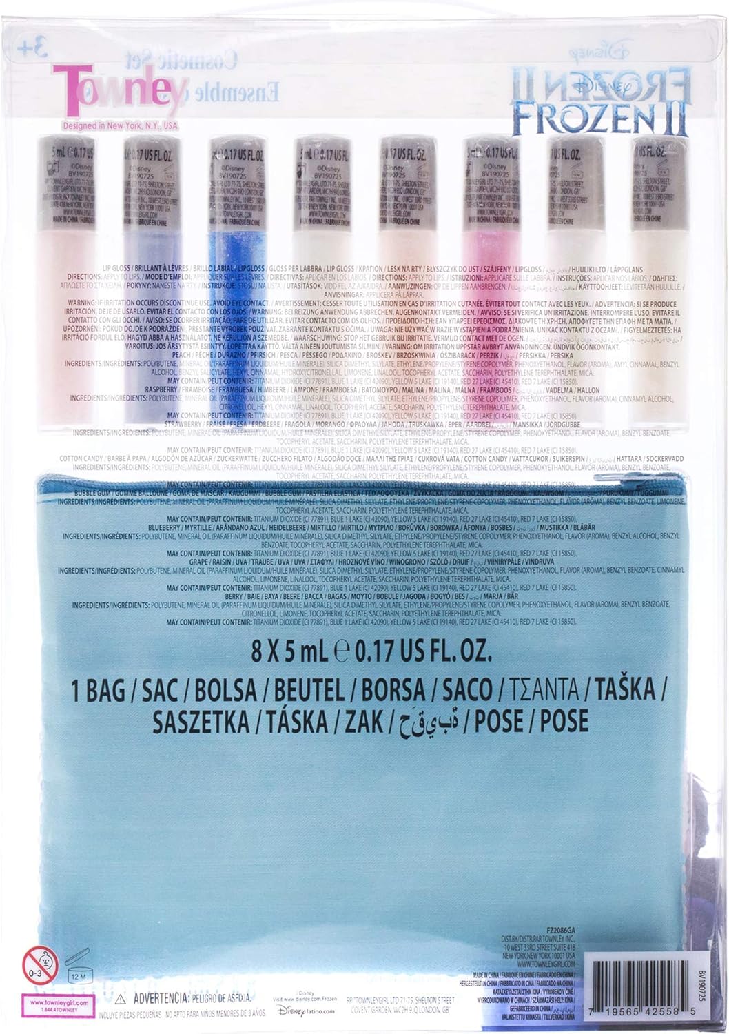 - INCLUDED WITH THE PURCHASE OF FROZEN GIRL LIP GLOSS KIT - Includes 1 Disney Frozen 2 Lip Gloss Set with a Zipper Sequin Bag that comes with 8 lip gloss colors, including pink, blue, dark purple and rose. All colors apply a shimmery look to lips. Flavors include bubble gum, cotton candy, grape and strawberry, blueberry, berry, raspberry and peach. Now your girl can enjoy putting on and practicing makeup with this mild, kid-friendly cosmetic set.