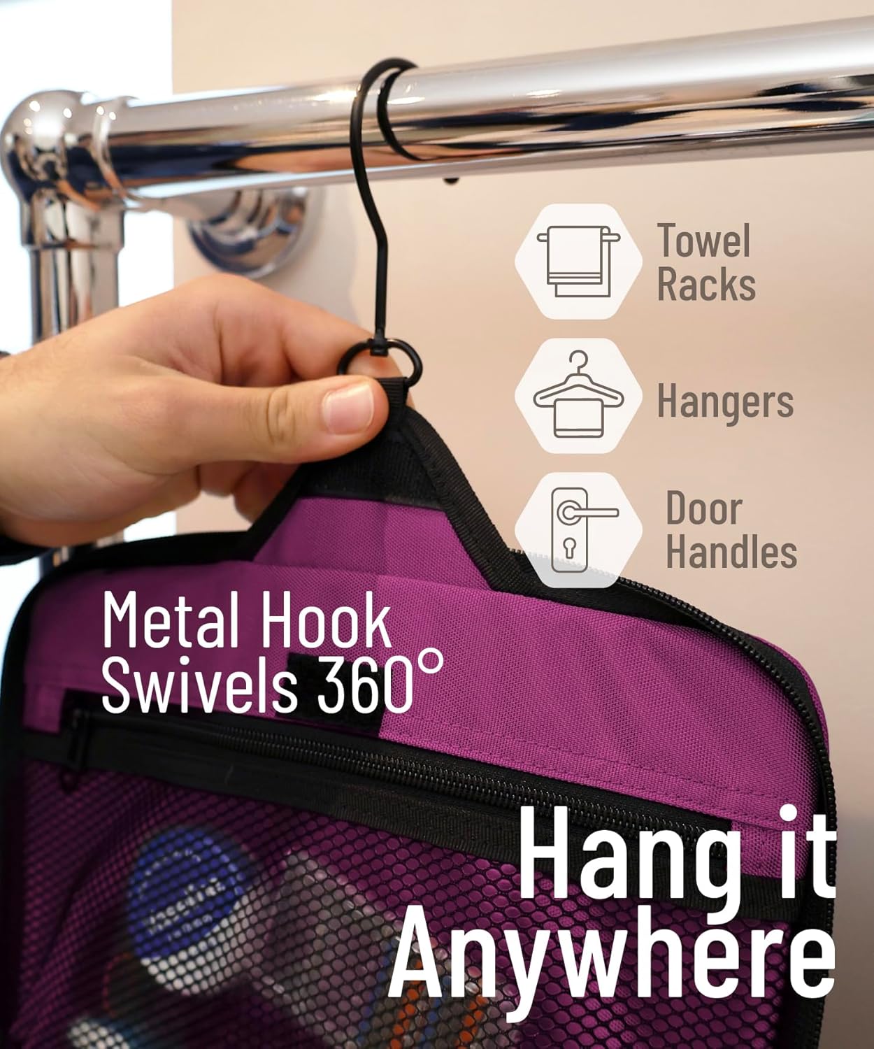 • Convenient Hanging Hook: The XXL metal swivel hook allows you to hang the bag anywhere, saving valuable counter space. It's perfect for use in hotels, bathrooms, or even on a camping trip.