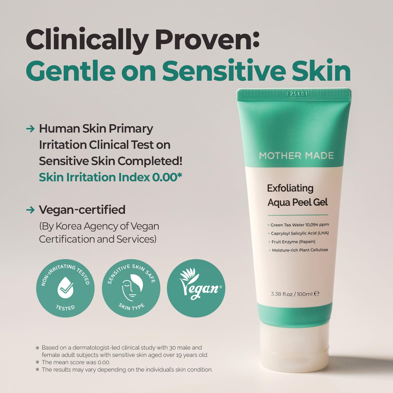 MOTHER MADE LHA Green Tea Exfoliating Aqua Peel Gel, Pore Care, Gentle Facial Exfoliator, Dead Skin Remover, Natural Cellulose for Peeling, Vegan, Korean Skincare, 2 Pack (100ml / 3.38 fl.oz)