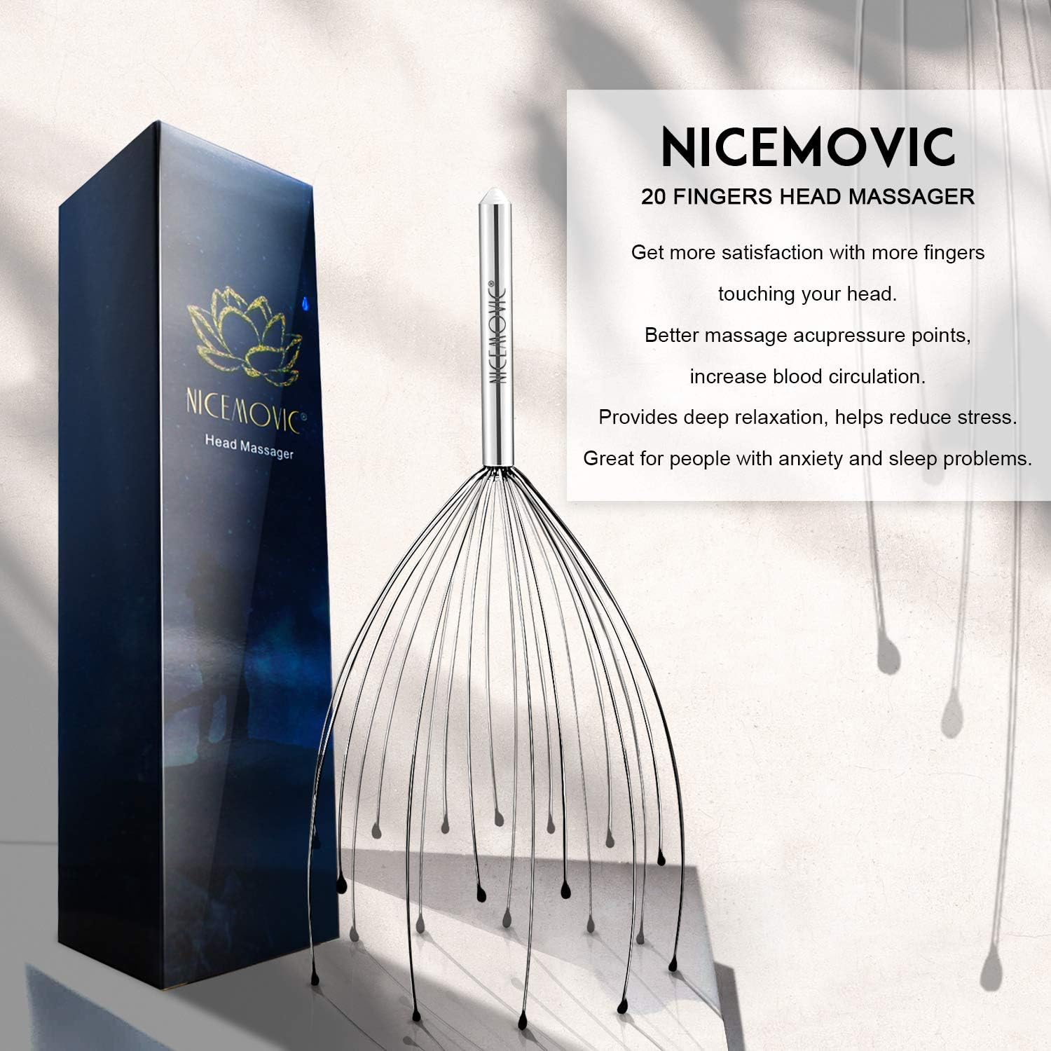 - 【Easy Function】Just holding the handle, putting it on your head then moving up and down softly; or make circular movements on your head and scalp, you will get the new different experience from the new 20 Fingers Scalp Massager. Made of high quality metal but also soft, durable and more stronger. The custom fit fingers of the massager will bend to perfect fit your head.
