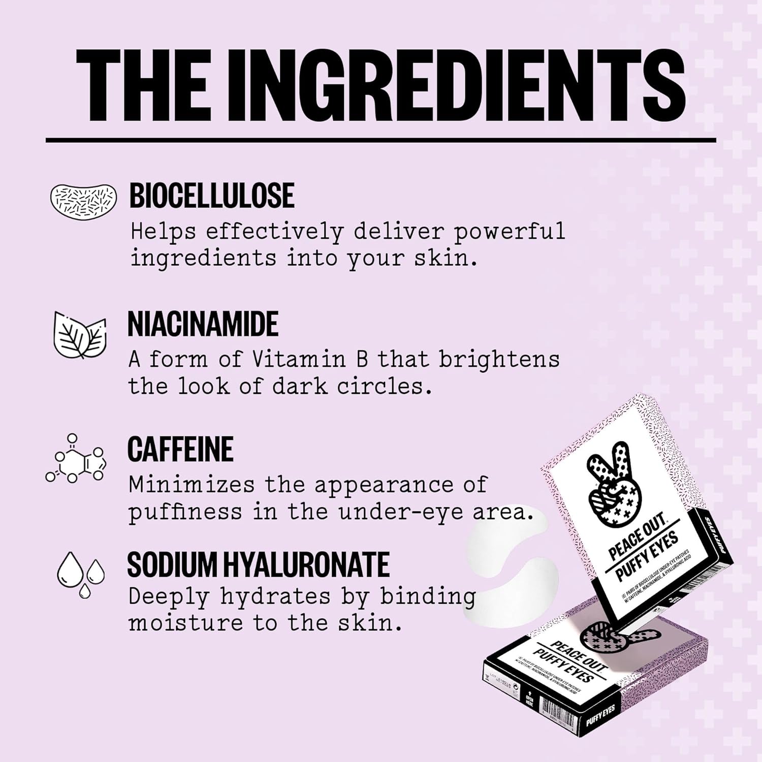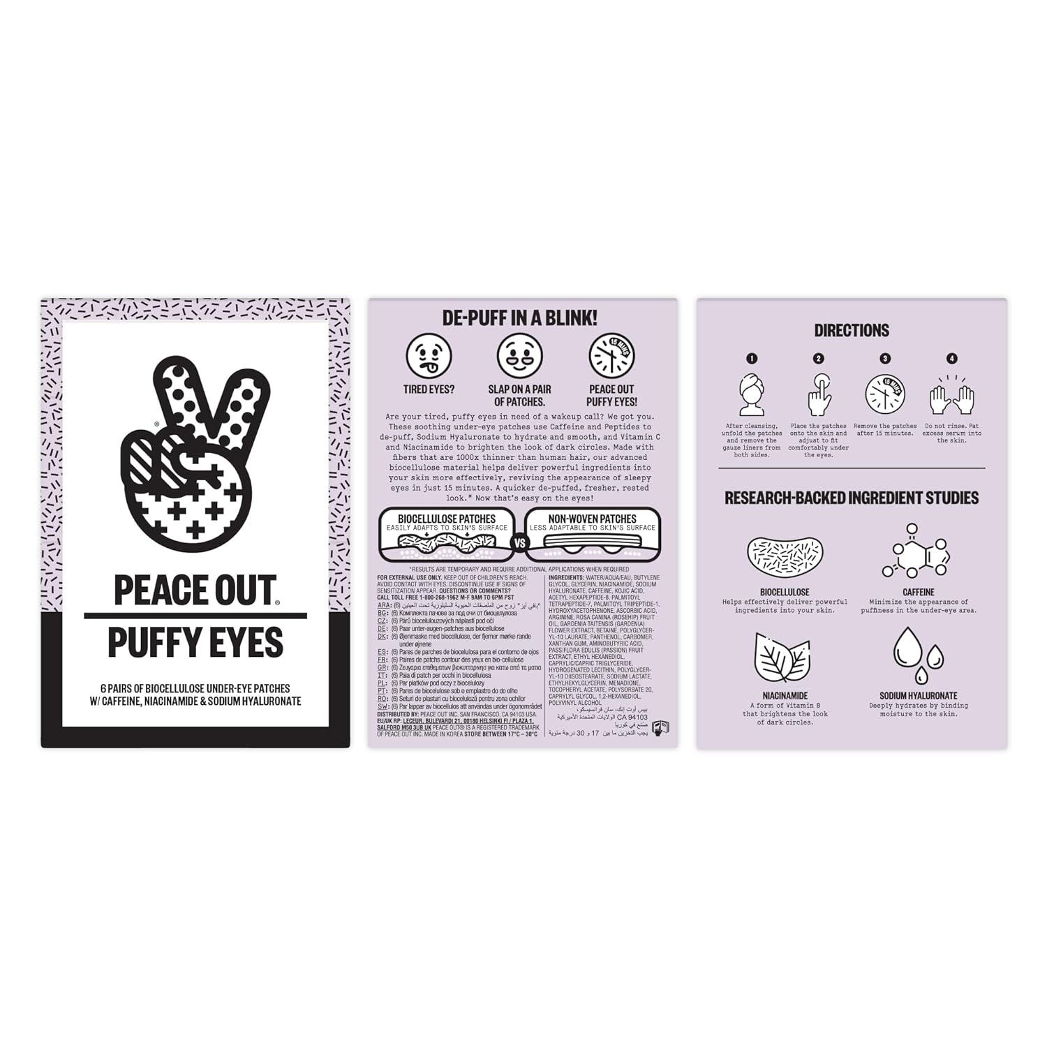 - Peace Out Puffy Eyes: 6 pairs of soothing biocellulose under-eye masks, awakening tired eyes for a fresh, revitalized look and feel.