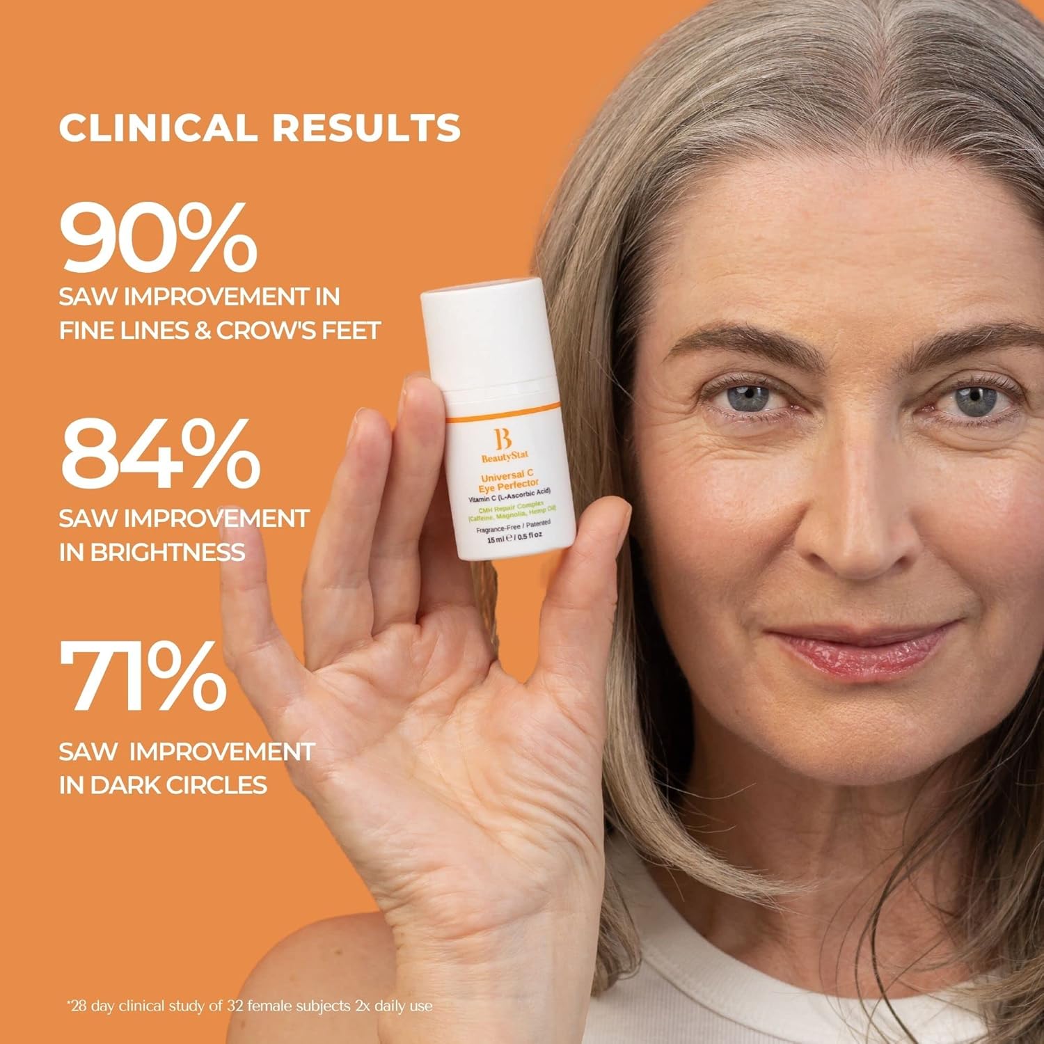 - Heal & Protect with 5% Pure Vitamin C (L-ascorbic acid) in Every Last Pump: Just like our patented & clinically tested Universal C Skin Refiner, the Universal C Eye Perfector uses Vitamin C that's been stabilized via the BeautyStat proprietary & patented delivery system. This puts us ahead of all the rest & ensures a potent pump from the first to the last. Finally an eye serum delivers lasting results that firm, lift & repair fine lines & wrinkles.