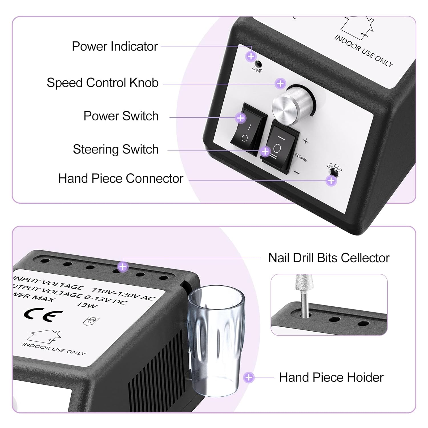 - Compact Electric Nail File:Nail drills for acrylic nails are compact enough for your desk, our nail drill machine designed with 6 nail drill bits holder and hand piece holder, it is more convenient for your manicure and pedicure