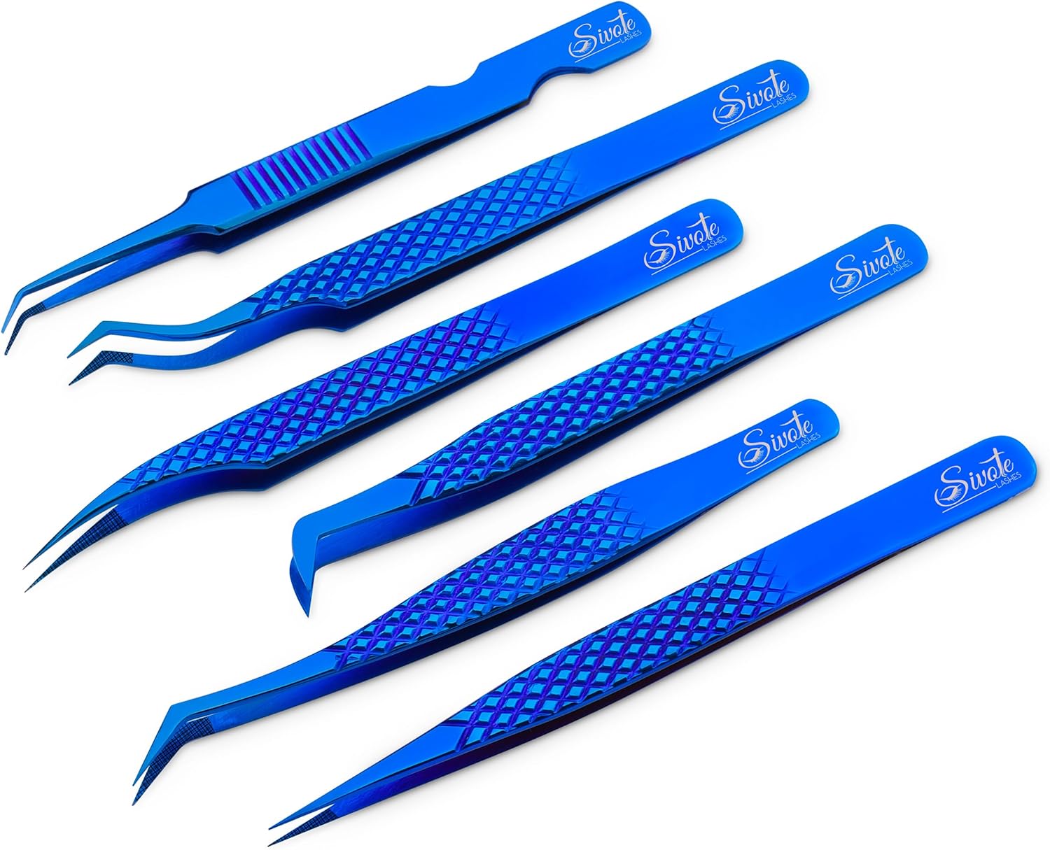 SIVOTE Eyelash Extension Tweezers Fiber Tips Japanese Steel, Set of 6 – Curved, Dolphin, 90° 45° Volume Boot & Slight Curved Tweezer – Professional Lash Tweezers for Lash Extensions Blue