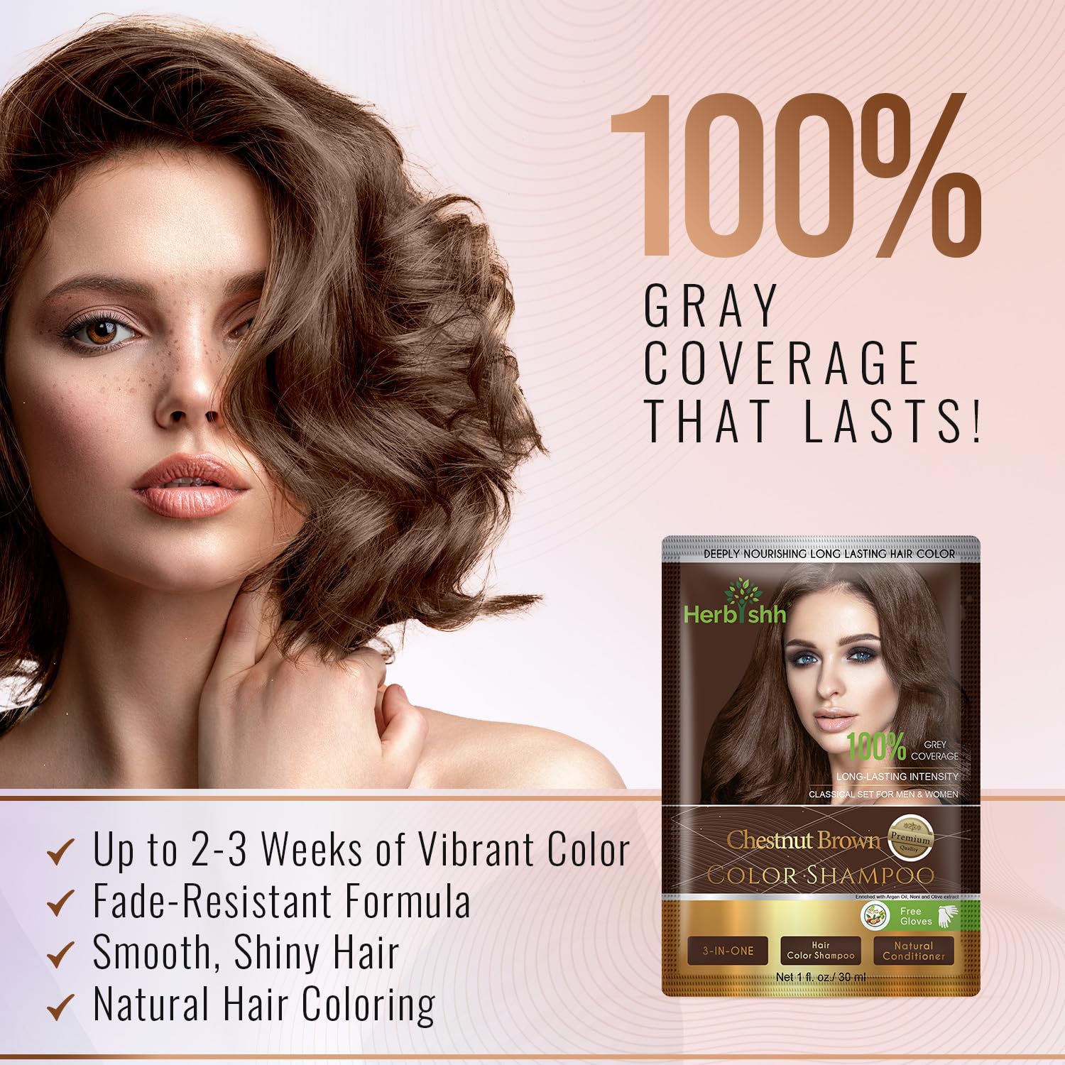 - LONG LASTING GREY COVERAGE β Give your greying hair a new lustrous, vibrant, and young look, while replenishing the lost health of weak strands with Herbishh Hair Color Shampoo for Grey Hair. With a special combination of active botanicals, our hair color shampoo dye is sure to give your hair a deep Chestnut Brown color that will last up to 2 to 3 weeks.