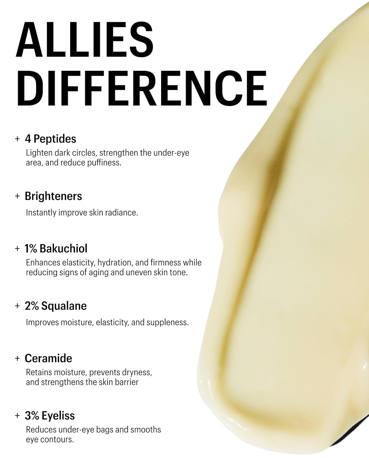 - YOUTH-ACTIVATING PEPTIDES TARGET 3 TYPES OF WRINKLES. Supercharged with plant-derived Bakuchiol and Vitamin C, this anti-aging eye cream reduces the appearance of wrinkle depth and targets multiple signs of fatigue.
