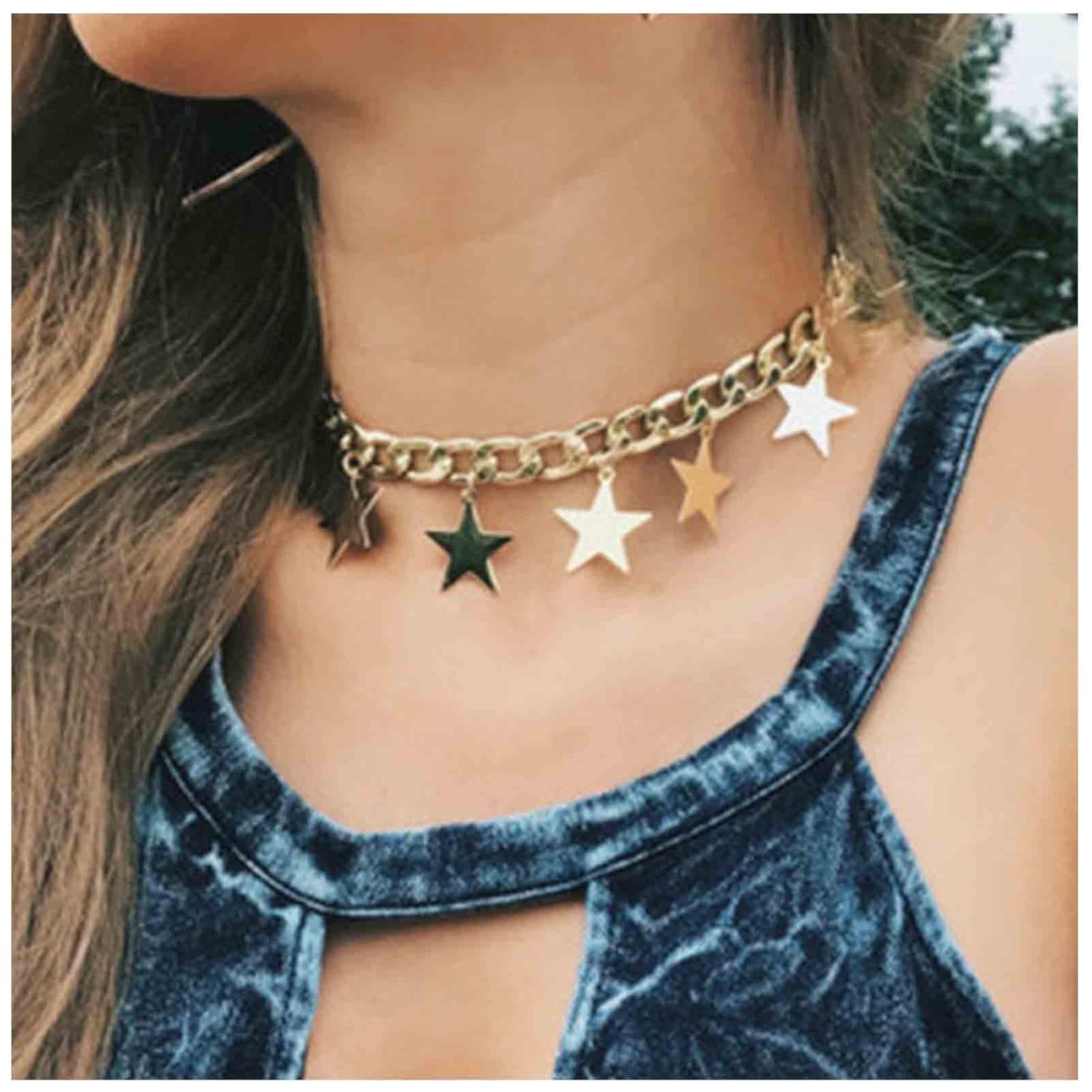 - Gold star dangly necklace choker with Real Images,available in gold,stay long and won't tarnish.
