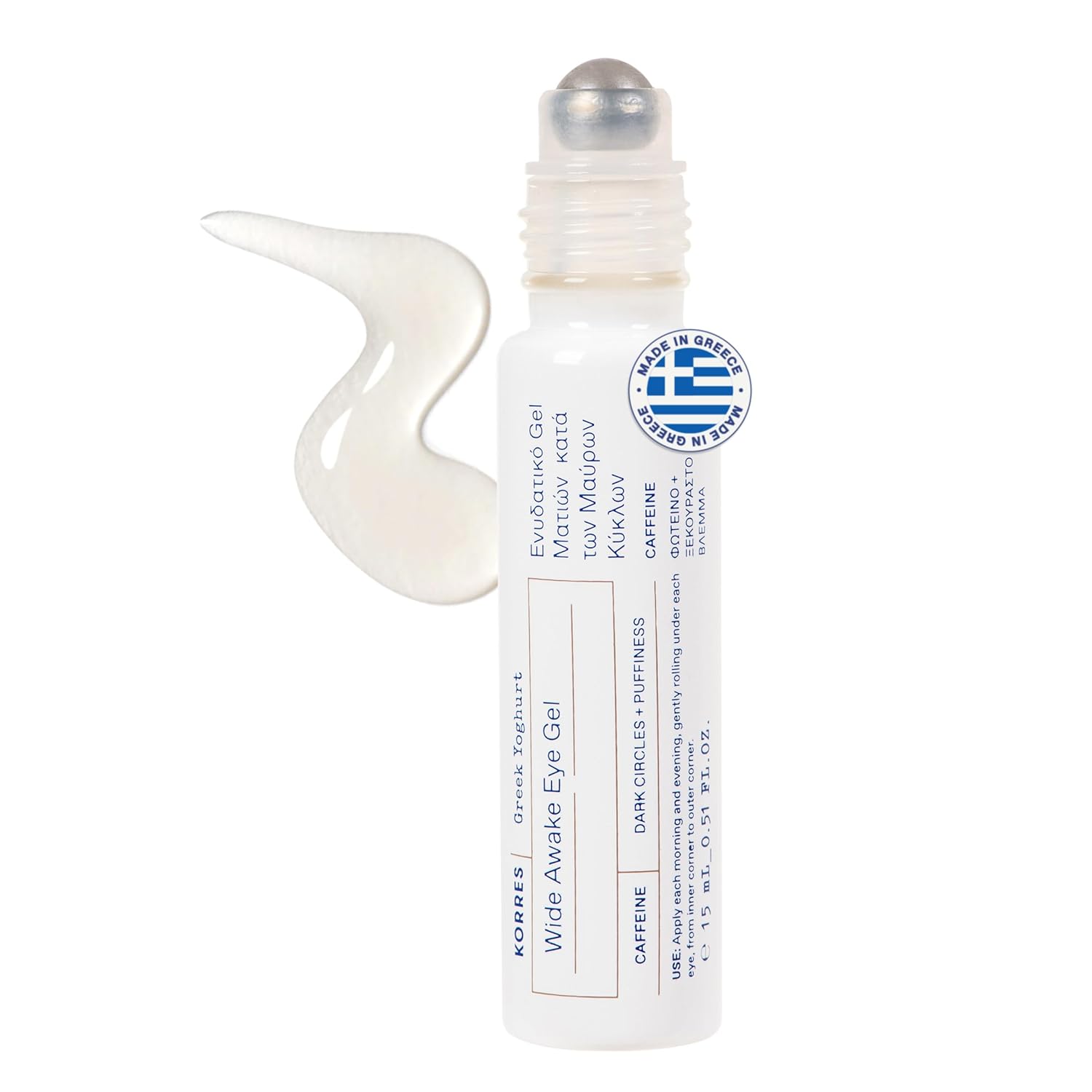 KORRES Greek Yoghurt Wide Awake Eye Gel Serum with Hyaluronic Acid and Caffeine for Dark Circles, Puffy Eyes and Under Eye Bags, Roller Massage Ball Applicator, Brightening and Hydrating, 0.51 fl oz