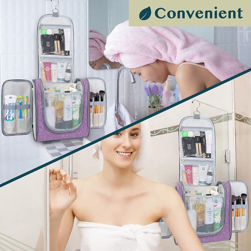 - COSMETICS TRAVEL BAG ORGANIZER: This toiletry bag for women has a hanging hook and multiple pockets that help you stay organizer during business trip, vacation travel. The hanging hook makes it easy to hang the toiletry bag to bars in the hotel shower bathroom. Unzip your toiletry bag to reveal compartments to organize your shampoo, skincare face hygiene products. This toiletry travel bag is an essential accessory for cruise in Europe, plane, Hawaii Trip, and honeymoon.
