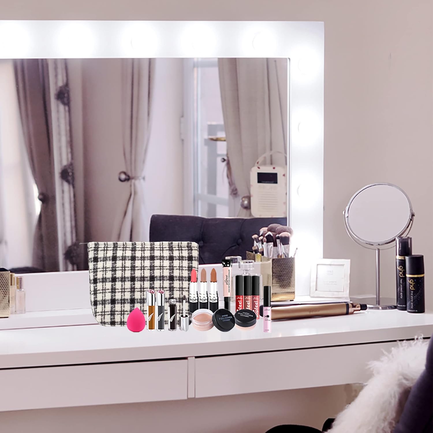 Makeup Bags for Purse Zipper Cosmetic Pouch Large Travel Canvas Make Up Organizer Tool Pouch for Women and Girls,Plaid Black
