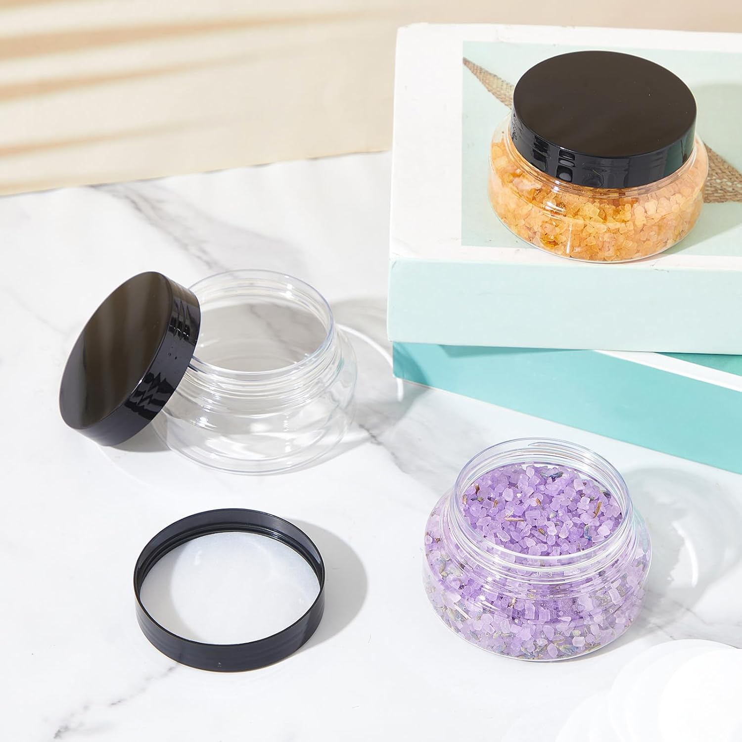 Tessco 24 Pack Plastic Jars with Lids Labels Empty Clear Plastic Jars Round Refillable Cosmetic Containers Body Butter Containers Bulk Sugar Scrub Bottle for Make Up(5 oz,Clear, Black)