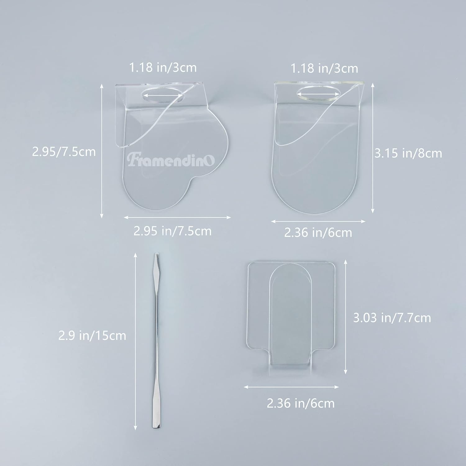 - SIZE-The size of the square makeup tray is 3*2.36in/7.7*6cm, the size of the love makeup tray is 2.9*2.9inch/7.5*7.5cm, and the size of the half circle makeup tray is 3.15*2.3 inches/8*6cm. Stainless steel cosmetic spatula is 5.9"/15cm.
