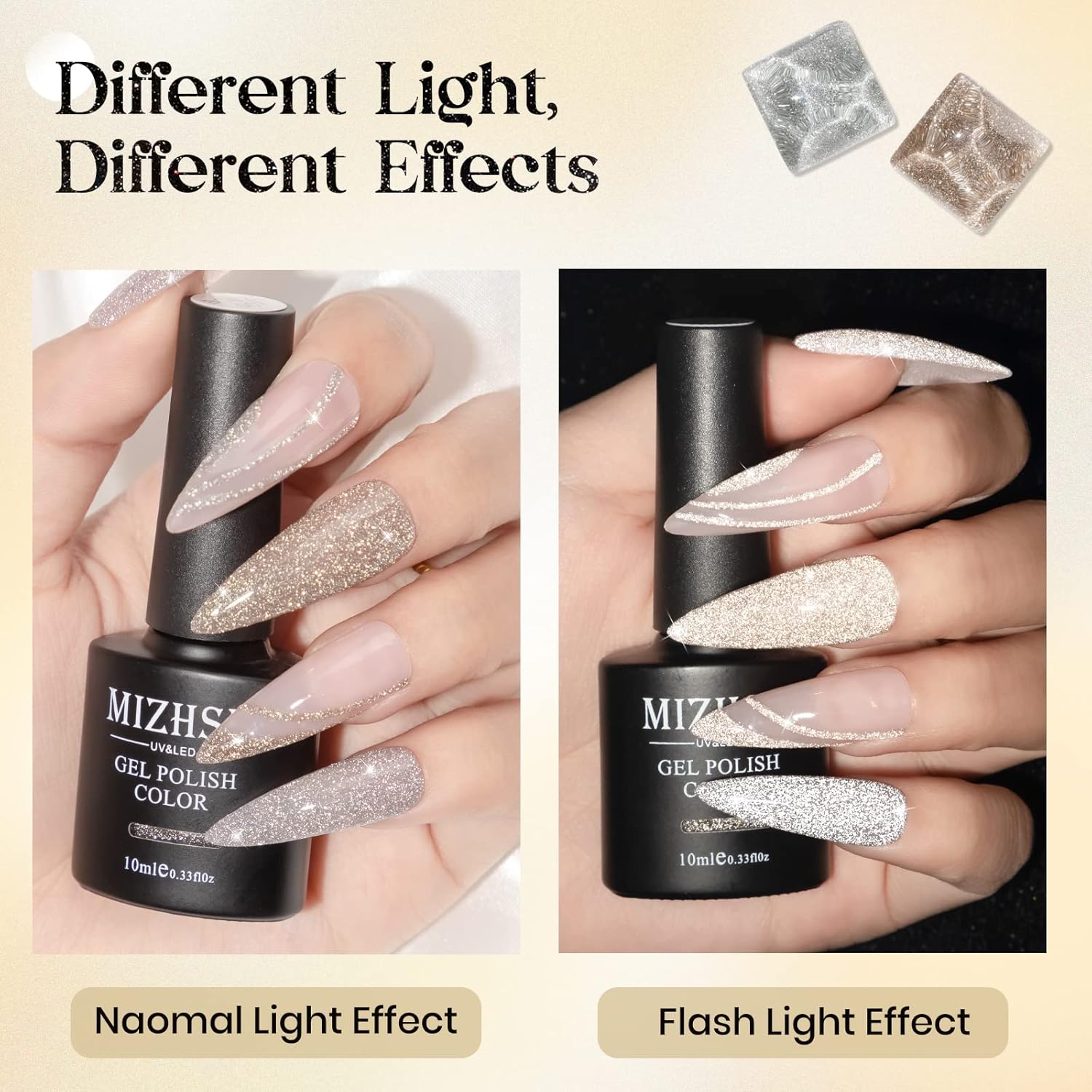 MIZHSE Reflective Gel Nail Polish, Glitter Silver and Gold Gel Polish 2 Colors, Sparkle Shiny Diamond Nail Gel Manicure Set Nail Art at Home Salon 10ML