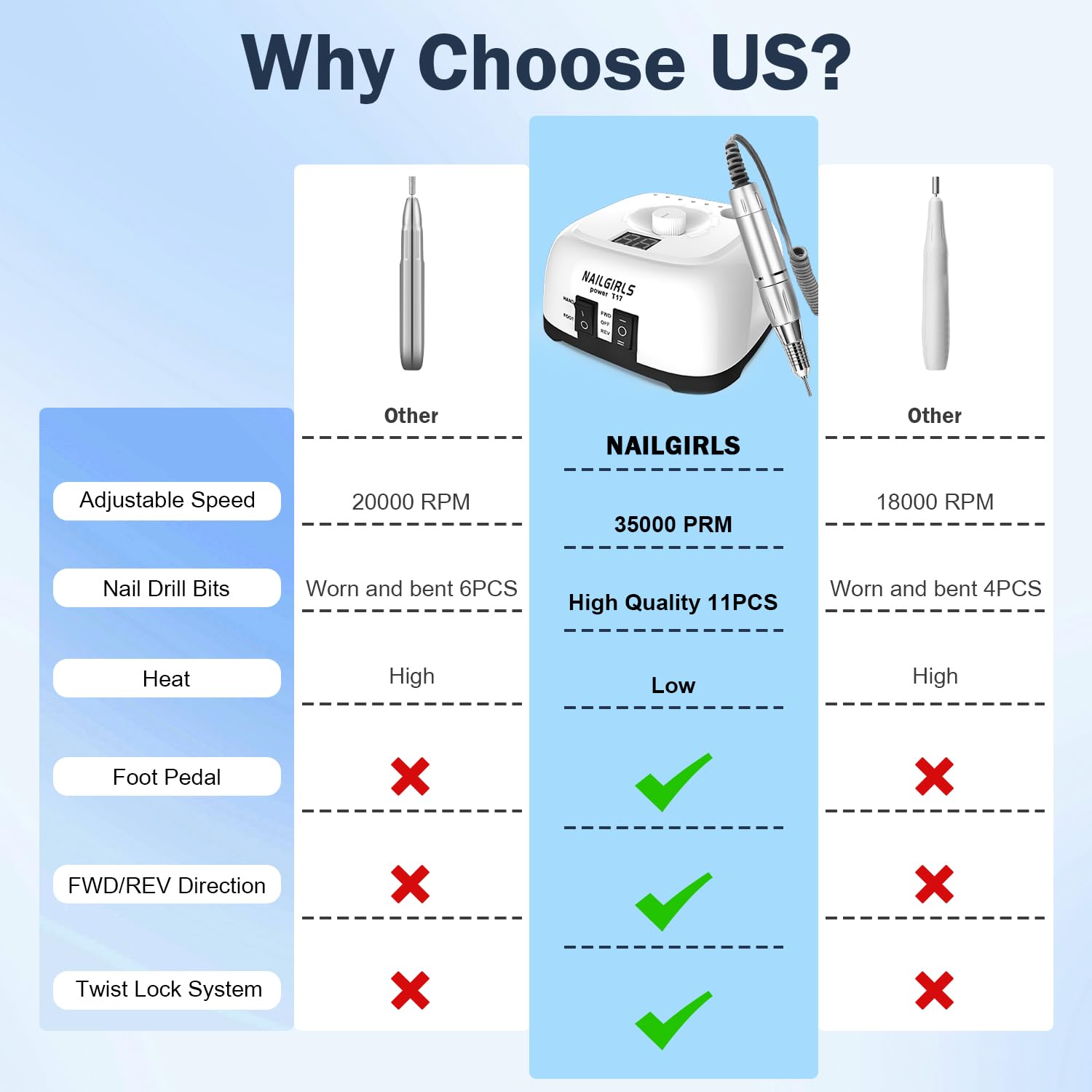 - 【All-in-One Nail Drill for Multiple Uses】The electric nail drill packed with 11 difference nails drill bits covers all your nail care needs, including acrylic nails, gel nails, dip powder nails, callus removal, manicure, pedicure, and polishing. Perfect for prepping nails, shaping acrylics, or smoothing calluses. NAILGIRLS NAIL DRILL is a must-have for both professionals nail technicians and DIY enthusiasts, ideal for nail salons, spas, and home use