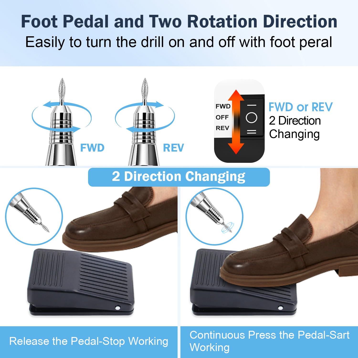 - 【Professional Nail Drill with 35,000 RPM Speed】Electric nail drill offers adjustable speed from 1000 to 35,000 RPM, giving you full control for precision and optimal performance. The Forward/Reverse switch allows for easy switching between clockwise and counterclockwise rotation, making it ideal for both right-handed and left-handed users. It fits with all standand 3/32'' drill bits, no worry that the mouth would become loose with too much pull in/out