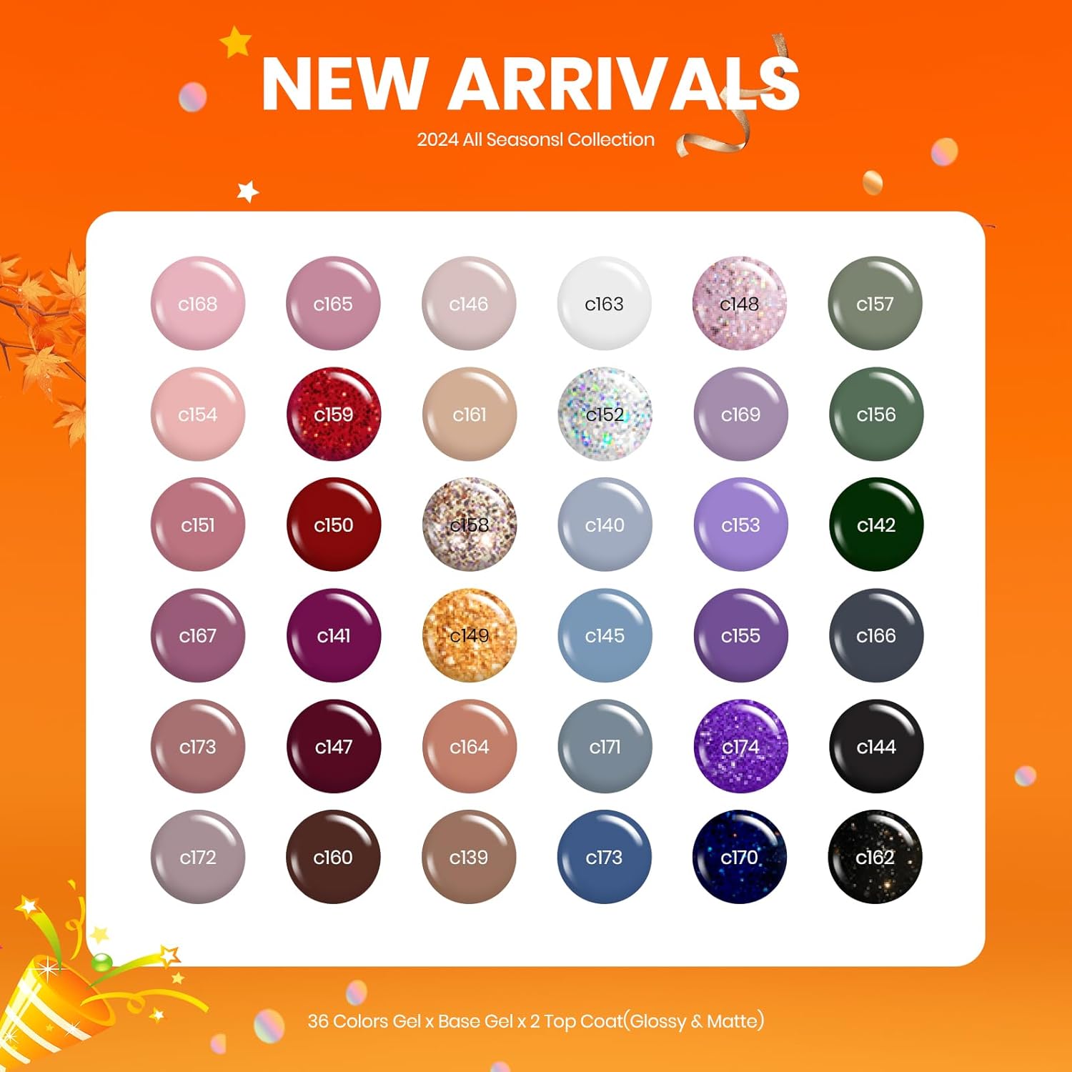 - Fall Gel Nail Polish Kit: 36 colors gel nail polish colors (0.17oz/5ml each bottle) + 3 x no wipe base and glossy matte top coat (0.25oz/7.5ml each bottle). Color theme: Wild flowers in ocean breeze, golden leaves on my bare hands, and glittering snowflakes, these are all my favorite things.