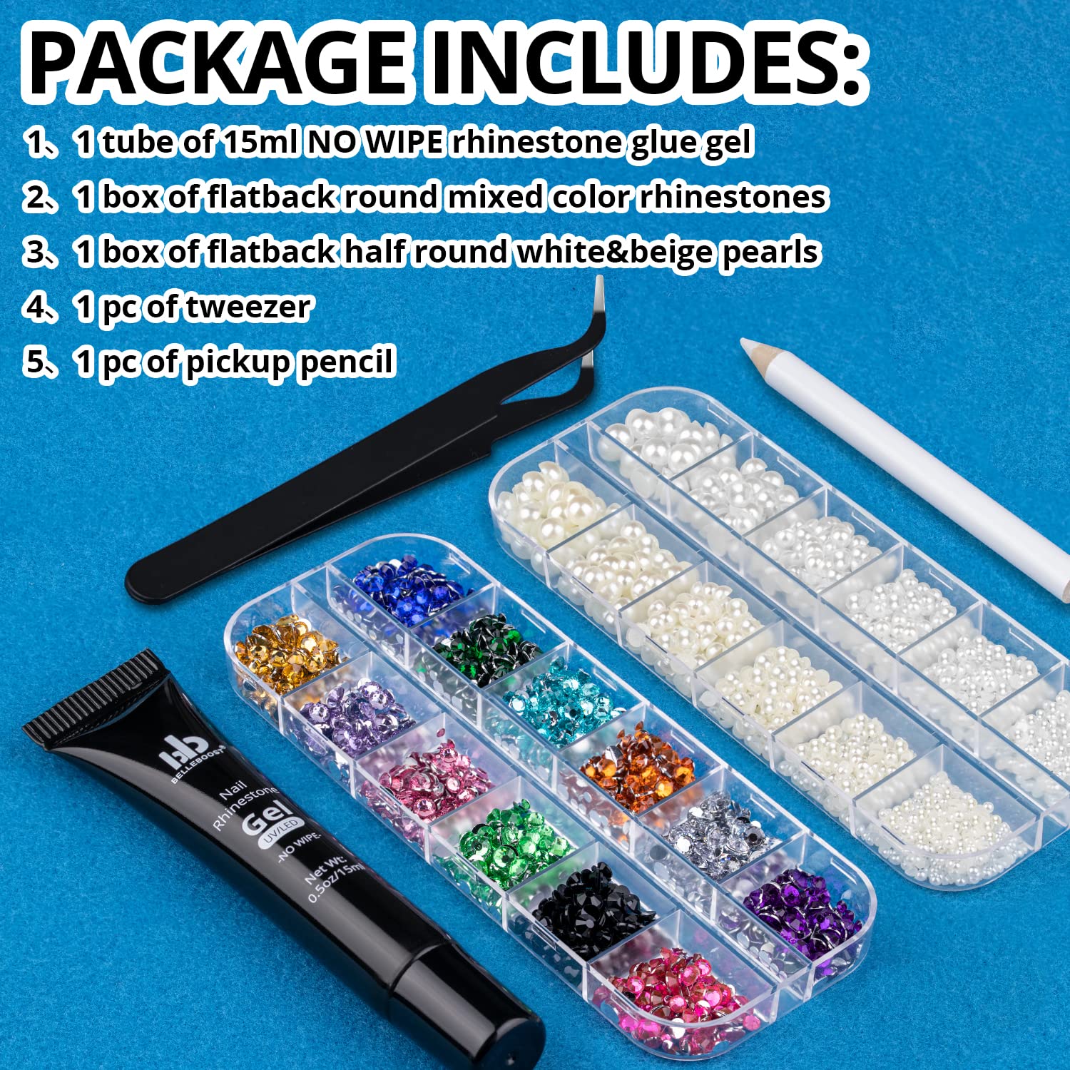 - 💎WHAT YOU WILL RECEIVE: This package contains 1 pc of 15ml tube design NO WIPE rhinestone gel glue; 1 box of flat back round mixed color rhinestones; 1 box of white&beige half round pearls; 1 pc of picker pencil and 1 pc of tweezer. This set helps you decorate your nails more conveniently.