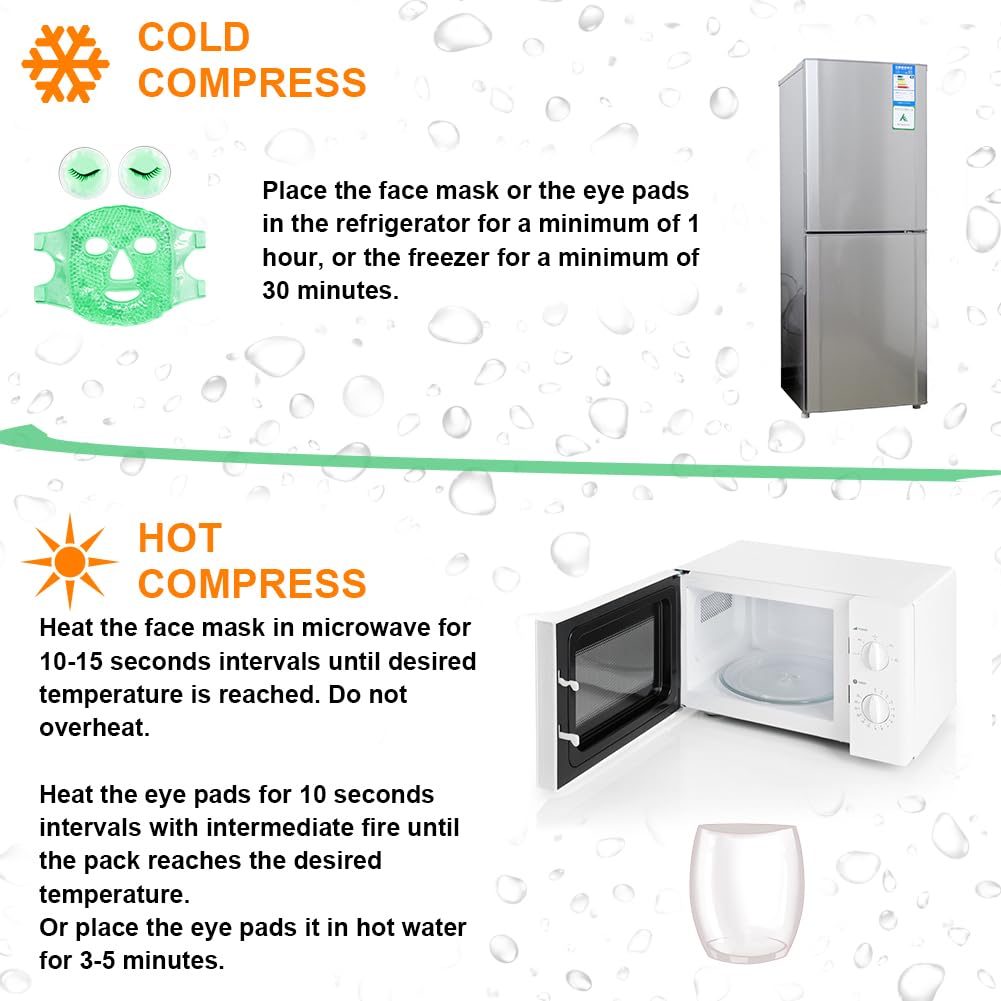 - 【Remedy for Eye and Face】Filled with Gel beads it can be used as a hot pack or a cold pack. A great remedy to reduce dry eyes, dry skin ,migraines. No more dark circles! Good for puffy eyes treatment. Use as a therapeutic aid for sleep improvement. Use to naturally shrink pores, calm acne prone skin, or for pore opening before a deep clean and makeup application. A essential product for beauty.Can also be used post wisdom teeth surgery, plastic surgery, for fever, shoulder, neck, back tension.