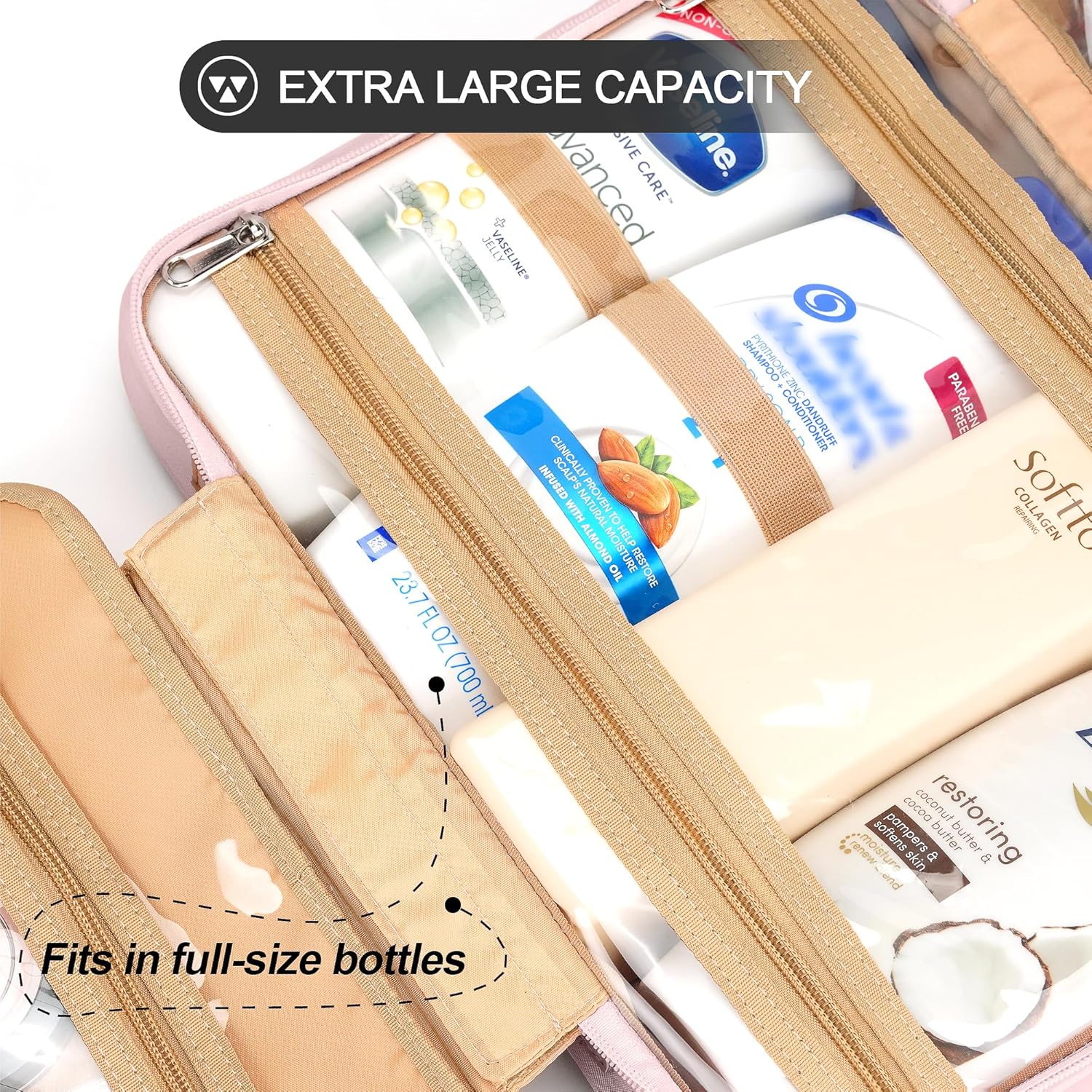 Travel Hanging Toiletry Bag for Women, Extra Large Makeup Bag, Holds Full-Size Shampoo, with Jewelry Organizer Compartment, Waterproof Cosmetic Bag, Toiletries Kit Set with Trolley Belt, Baby Pink