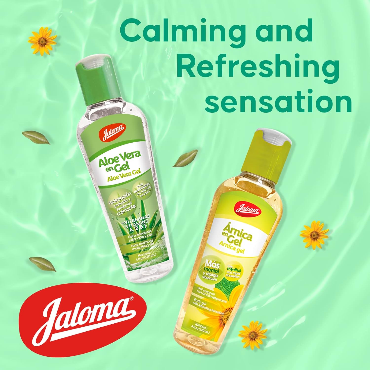 - Thanks to the remarkable properties of Jaloma Arnica and Aloe Vera Gels, you can use it on the skin to help you treat muscle or joint ailments and discomfort while moisturizing and calming your skin.