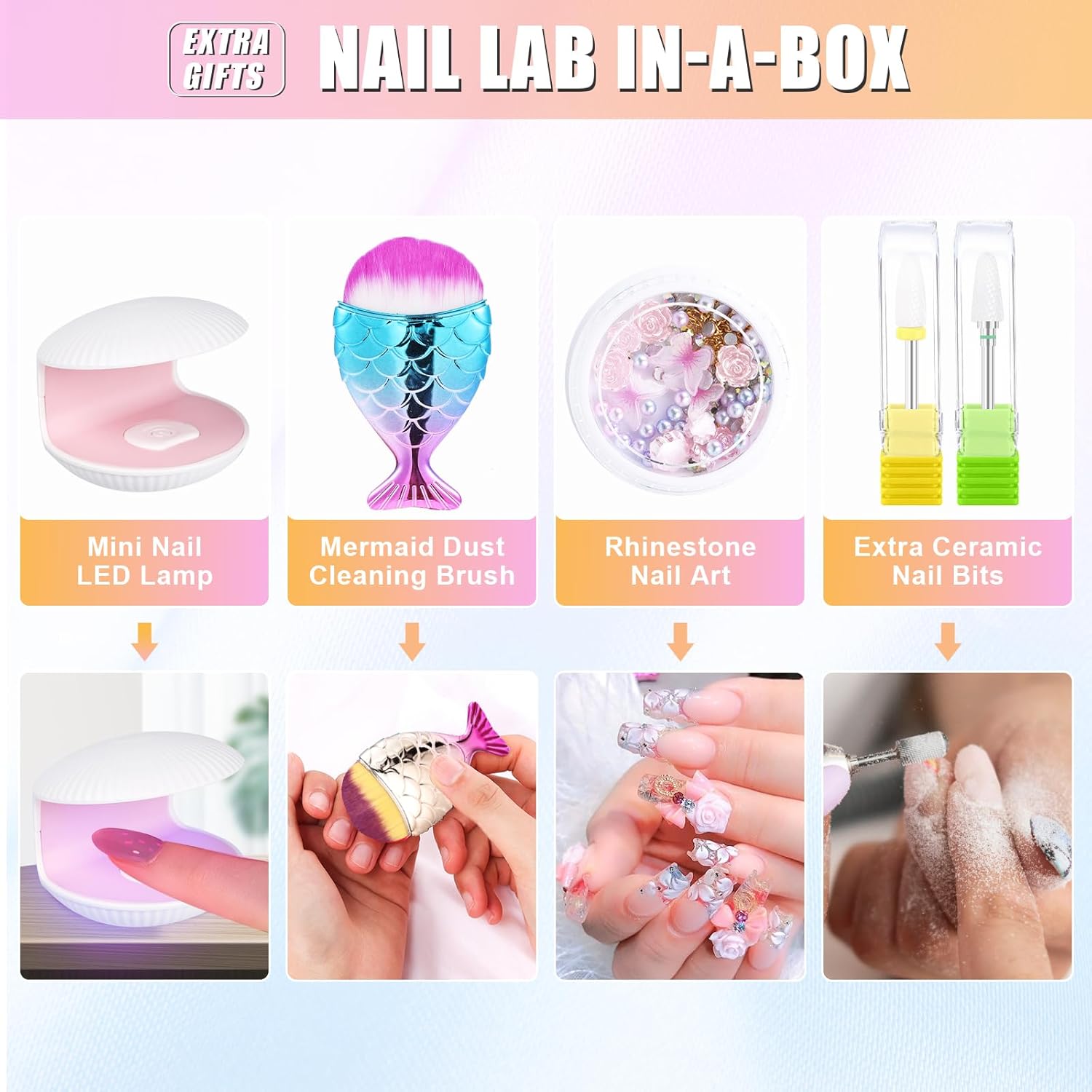 - 【Multi-Functional Drill Kit】:Package come with 5pcs nail drill bits and sanding bands. 5 extra gifts, 1 UV lamp, 1 box of nail art diamond, 1 cleaning brush and 2 ceramic nail drill. Pourcare nail drills achieve any manicure you want. Powerful for natural acrylics nails, gel polish dip powder nails as well as the removal of the cuticle & calluses, carving, engraving, routing, grinding, sharpening, sanding, cutting, polishing, drilling.