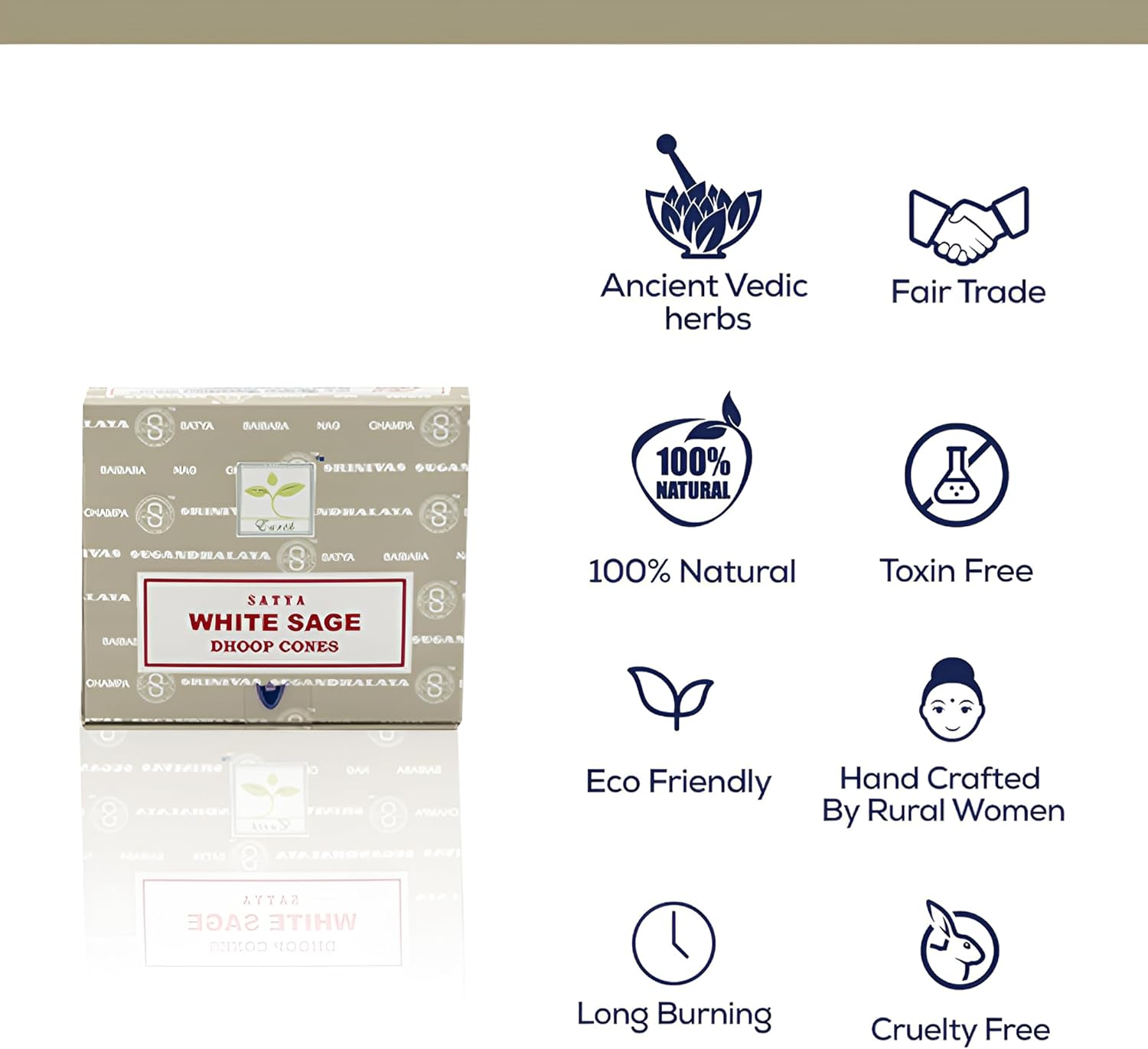 - β 144 Dhoop Cones in 12 Boxes: Each pack contains 12 boxes, each filled with 12 earthy and soothing white sage-scented dhoop cones, providing you with a total of 144 cones for long-lasting use.