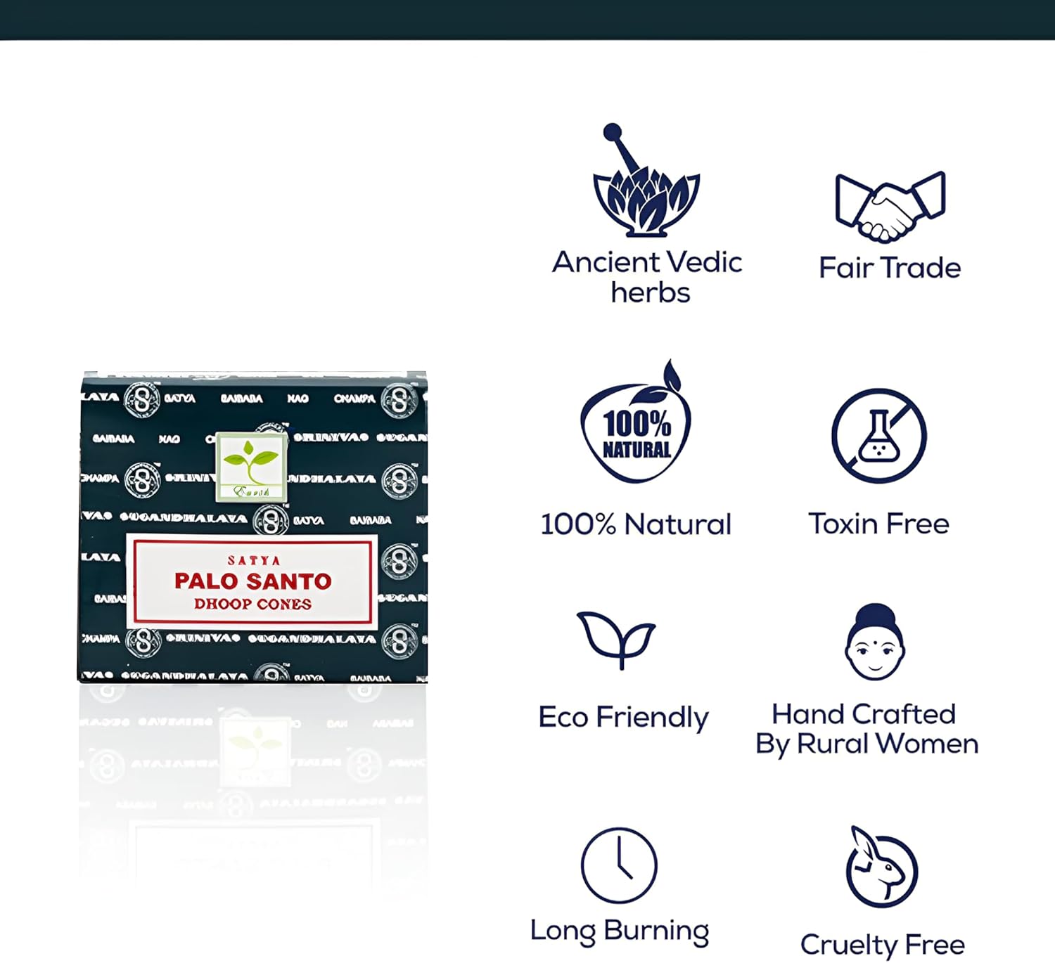 - β 144 Dhoop Cones in 12 Boxes: Each pack contains 12 boxes, each filled with 12 earthy and soothing palo santo-scented dhoop cones, providing you with a total of 144 cones for long-lasting use.
