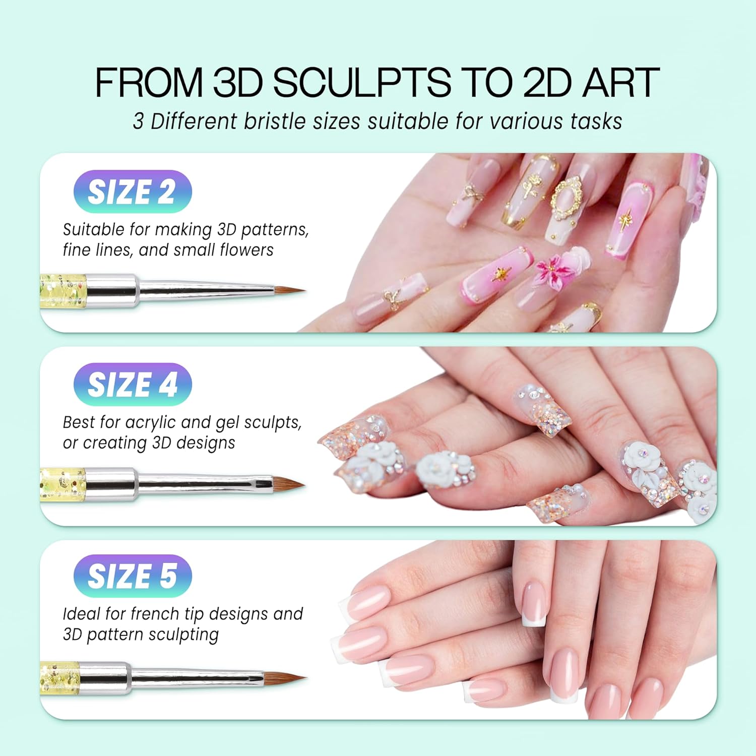 - [Design] Featuring a slim handle with eye-catching, shimmering glitter and a sleek silver ferrule, this 3D nail art brush offers both elegance and precision, making it ideal for intricate detailing.