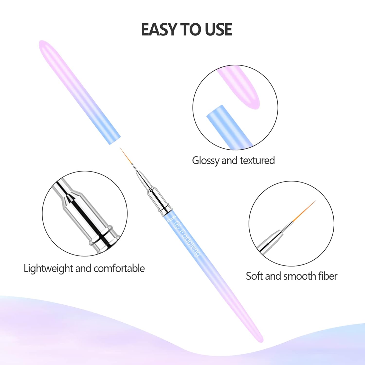 • High Quality - The head of the nail art brush is made of high-quality fibers, soft but non-deformation. The handle part of the nail liner brush is made of lightweight metal, durable and suitable for daily use. Each with a cap to protect the nail art liner brush from dust and forking