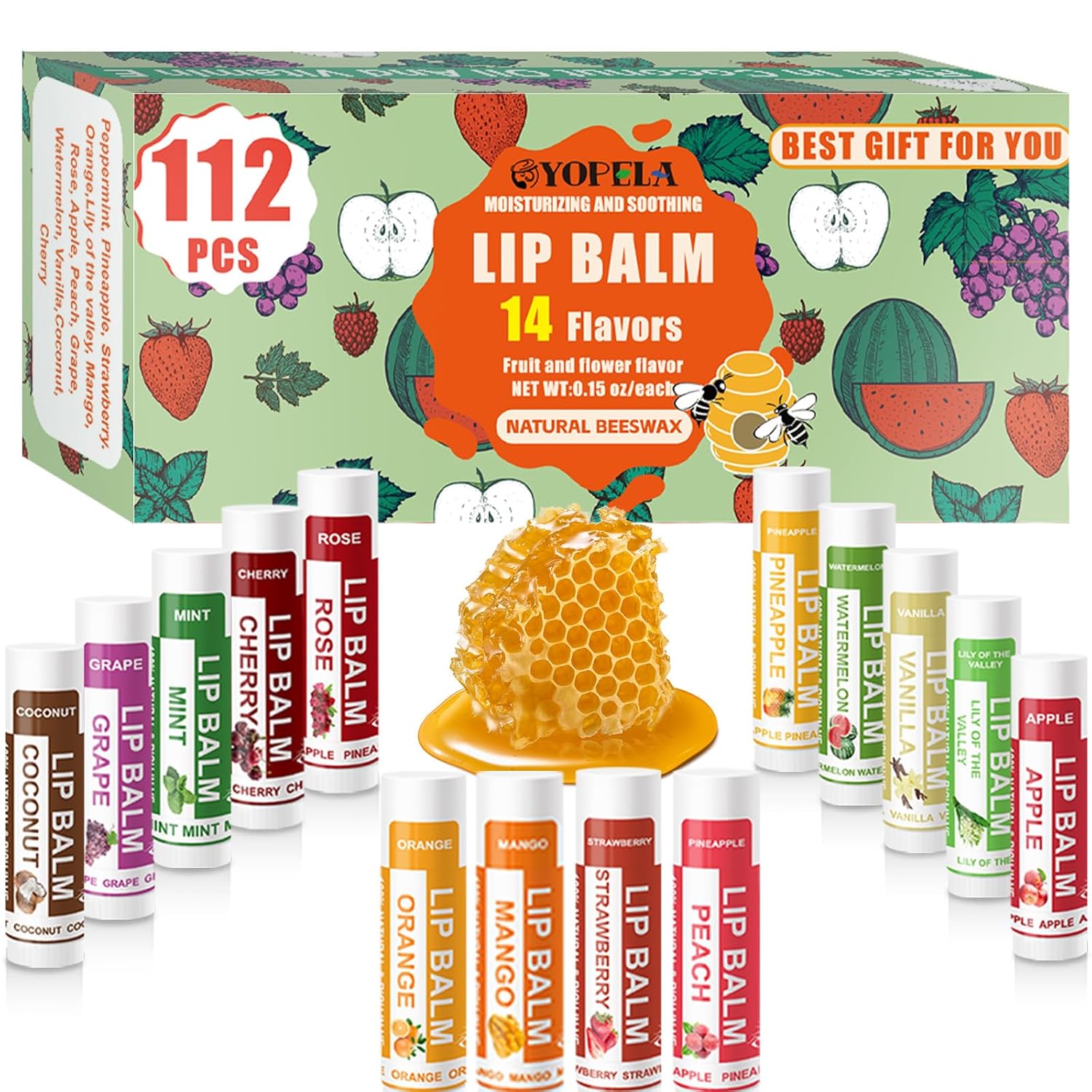 YOPELA 112 Pack Natural Lip Balm Bulk Lip Moisturizer with Vitamin E and Coconut Oil - Hydrating, Moisturizing, Soothing, and Repairing Dry and Chapped Lips Valentine's Gift - 14 Flavors - Non-GMO