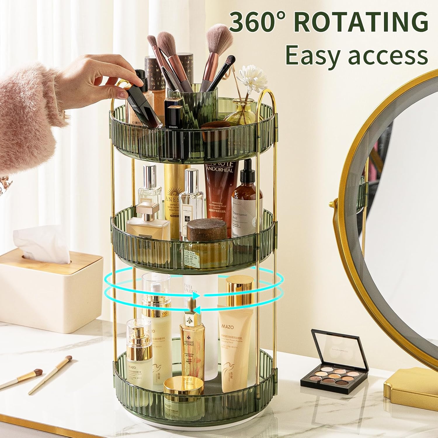 - 【360° Rotation】: The large-capacity makeup organizer allows you to store your cosmetics and skincare products in a clean and orderly space, 360° smooth rotation allows you to quickly find what you need, It's very convenient. The raised edges prevent cosmetics from falling off during rotation.