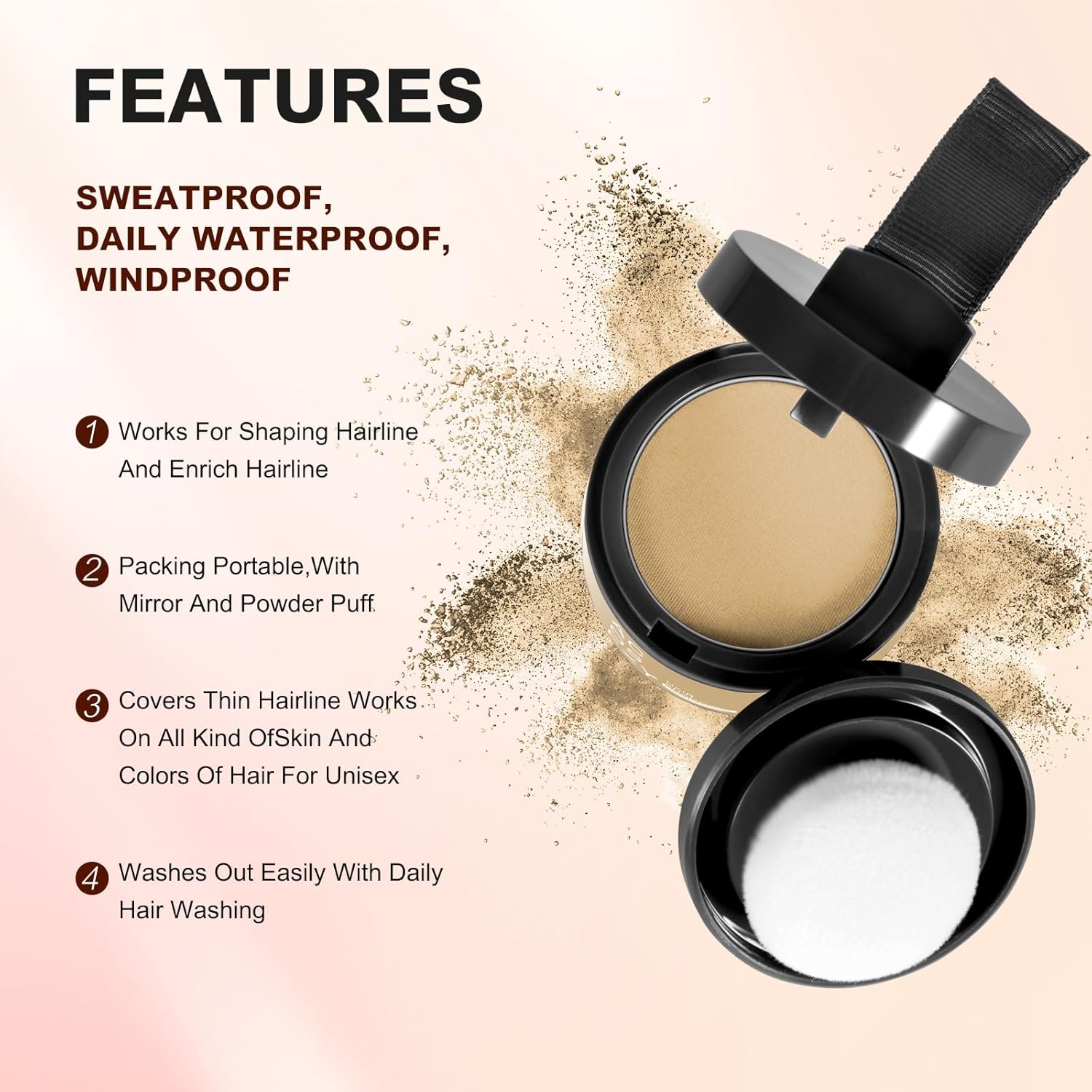 - 1.Instant Coverage Hair Root Touch Up -The Acosexy Hairline Powder puff can accurately cover the roots of hair. Locks on Until You Shampoo: Hair loss? Skip the embarrassing all-day touch-ups .The color is firm. Make the hair fluffy. Will Makes hair color natural and vibrant. Great for all hair types and texture!