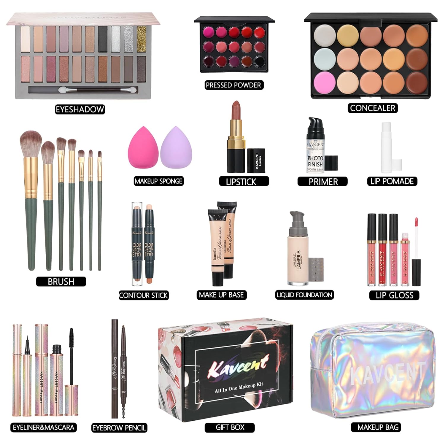 - 【All In One Makeup Kits】A perfect makeup sets that includes Foundation,Face Primer,20 Color eyeshadow palette, lipstick palette, lipgloss, lipstick ,concealer cream, makeup brush, concealer palette, Contour Stick,eyeliner, lip balm, mascara,powder puff, Cosmetic bag