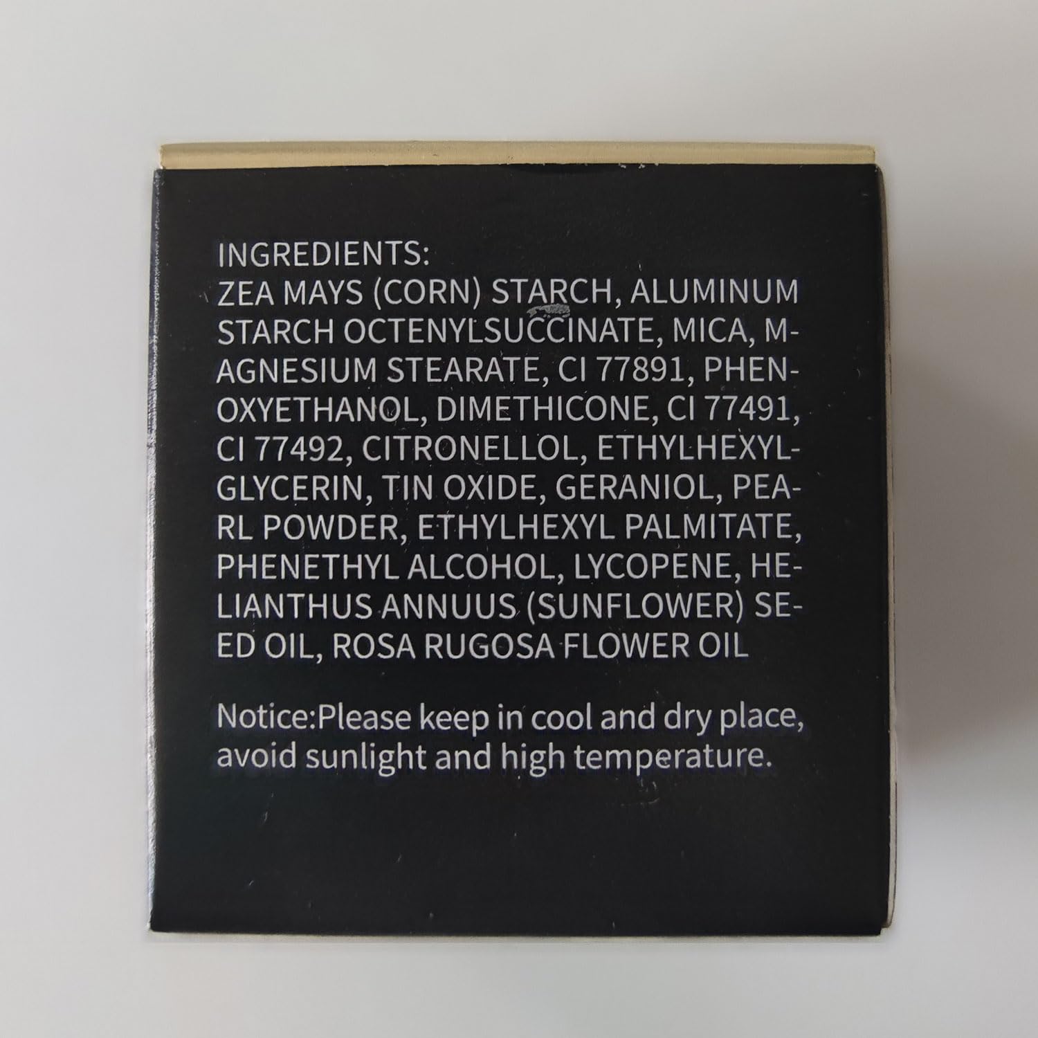 - [Various Plant Ingredients]-(1)Zea Mays (Corn) Starch: fine and smooth, with excellent moisturizing effect, making the skin more tender and delicate; (2)Pearl Powder:nourish the skin and brighten the complexion; (3)Lycopene:a natural pigment contained in plants,which is conducive to skincare; (4)Rosa Rugosa Flower Oil: it can make your skin smooth and hydrated.