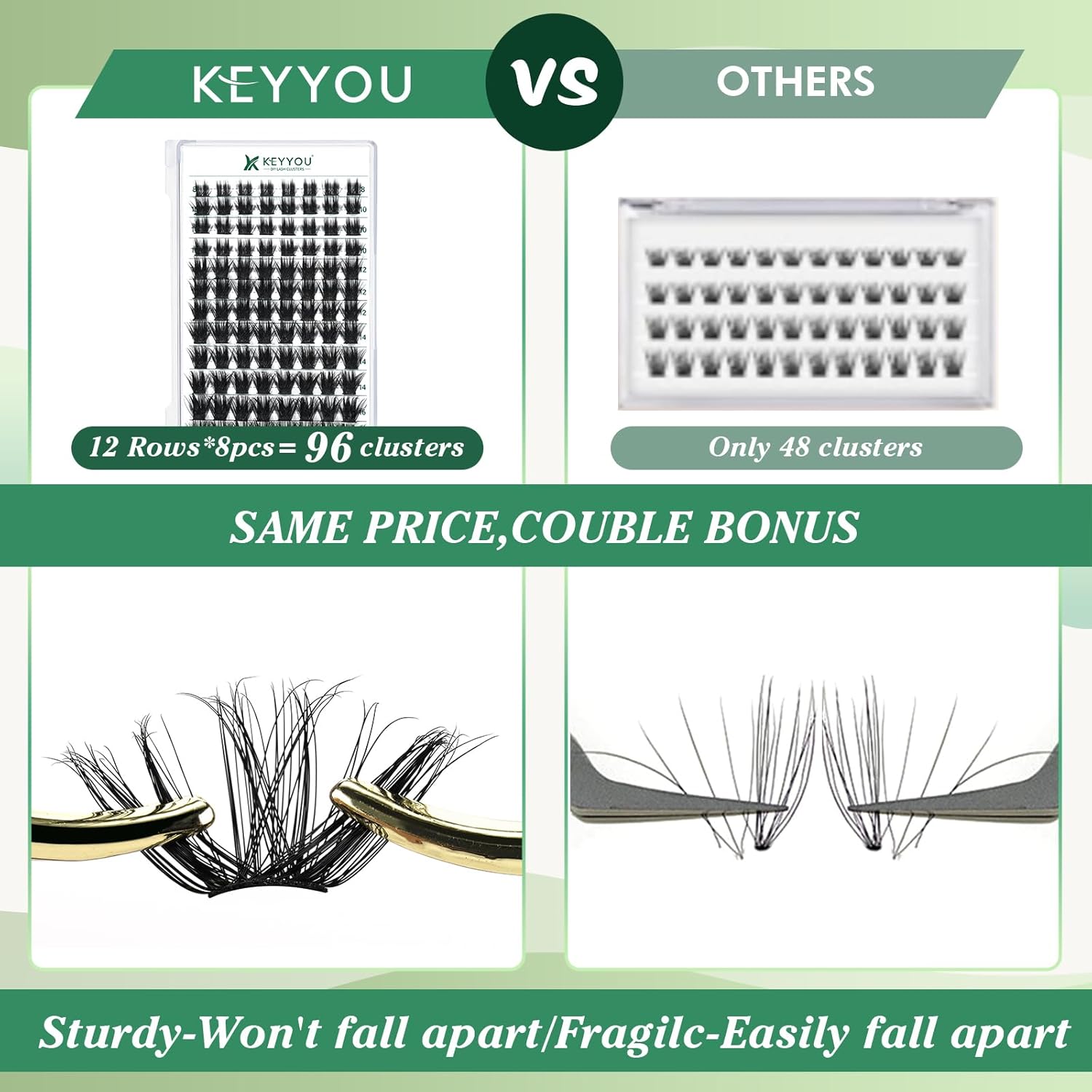 - 【Soft&Comfortable】KEYYOU lash cluster are made of imported materials,the stem line is thinner and softer, the eyelash cluster are lighter and more comfortable to wear.96 clusters in one tray ,more cost-effective.