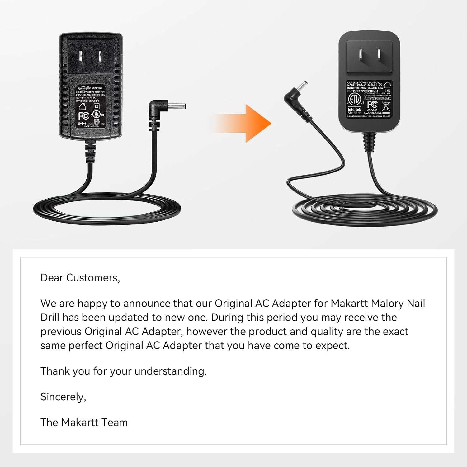 - Original Charger Adapter Cord for Malory Nail Efile: AC Charger supply supports 100-240V worldwide input voltage. It is specially offered by Makartt for Malory pink nail drill machine only.