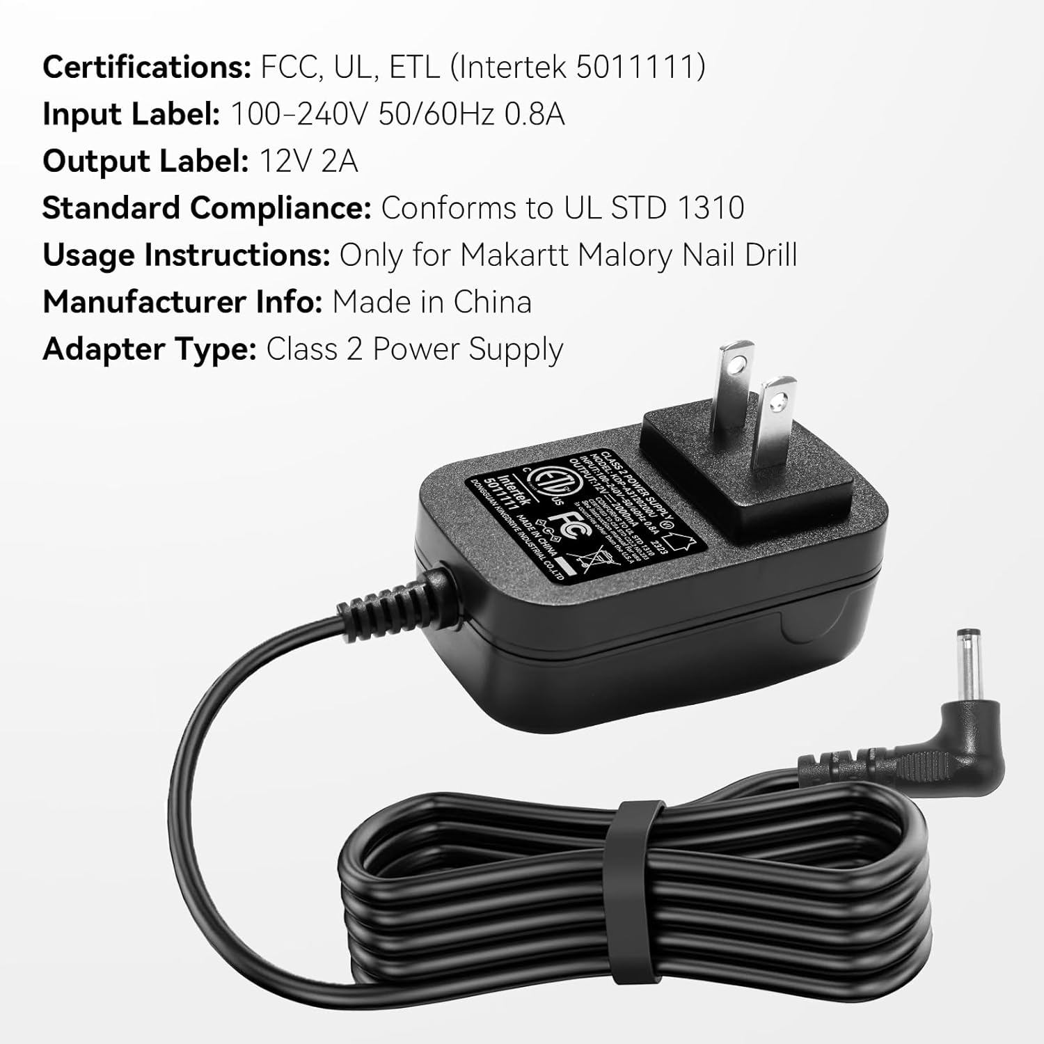 Makartt Original Power Charger Adapter for Malory Nail Drill, 12V 2A AC Battery Supply Cord for 30000RPM Rechargeable Electric File Manicure Tech Art Salon Home DIY Use