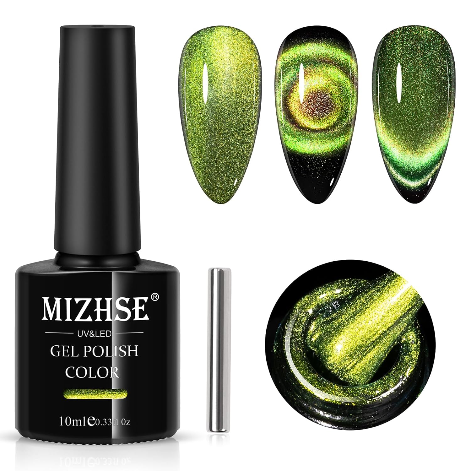 - MIZHSE 9D Cat Eye Gel Nail Polish: 1 color magnetic gel polish, 1 magnet stick, without black base. Save your money and time to nail salon! Enjoy the DIY fun of nail beauty at home. Suitable for natural nails, false nails, acrylic nails, etc.