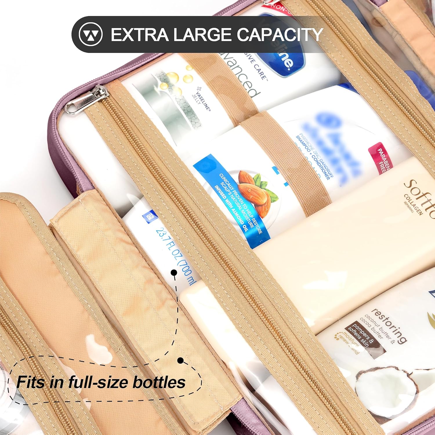 Travel Hanging Toiletry Bag for Women, Large Makeup Bag 8 Leak Proofing Silicone Bottle Covers, Waterproof Cosmetic Bag with Jewelry Organizer Compartment, Toiletries Kit Set, Purple