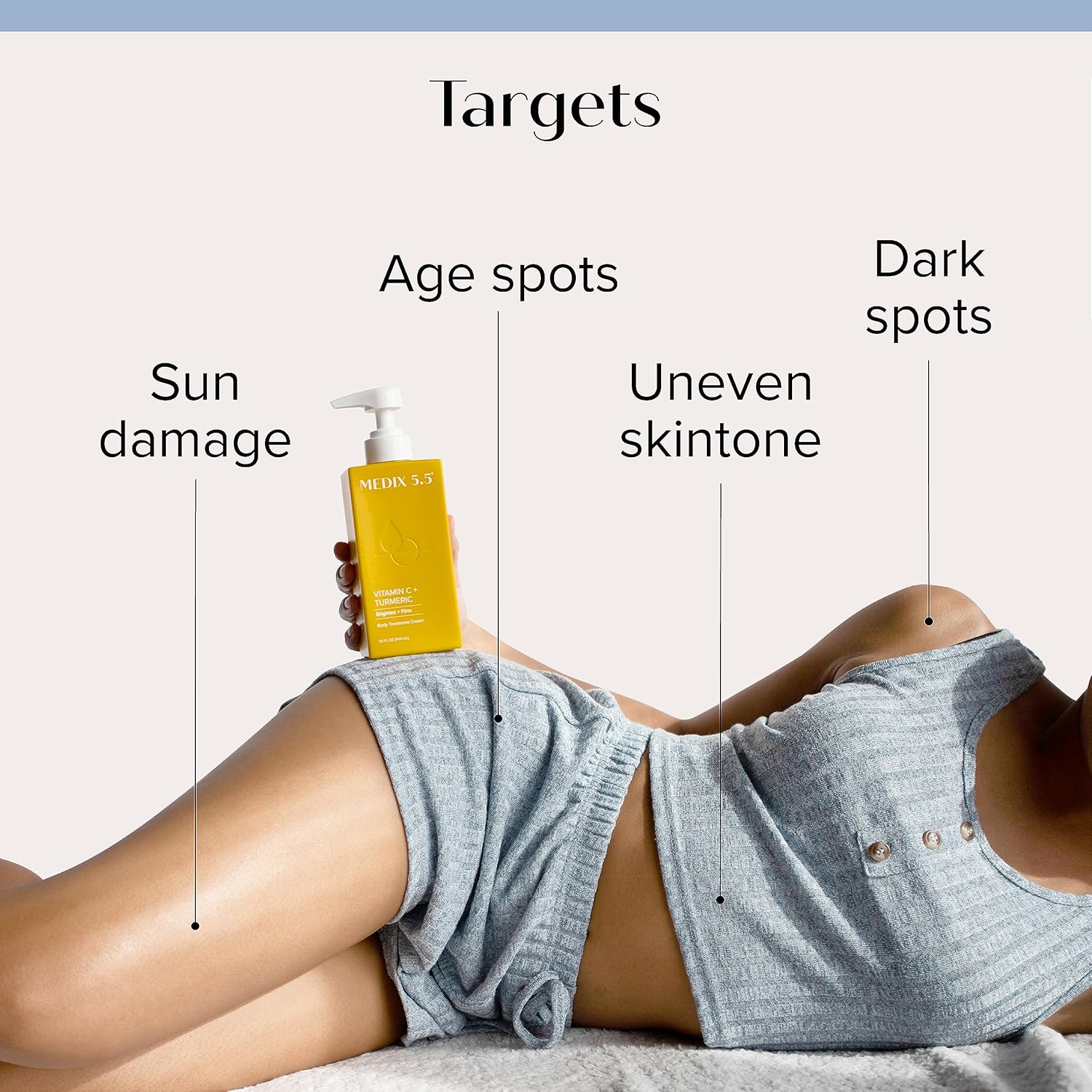 - VITAMIN C β Incorporating a Vitamin C infused body lotion into your daily skincare routine can help to promote a more healthy, radiant, & youthful-looking complexion. Vitamin C helps promote an even skin tone, while also helping stimulate collection production to improve skin elasticity + firmness. Vitamin C also helps to minimize redness or irritation in the skin, helps protect from environmental stressors like UV rays, and helps reduce the appearance of fine lines, sun damage, & wrinkles.