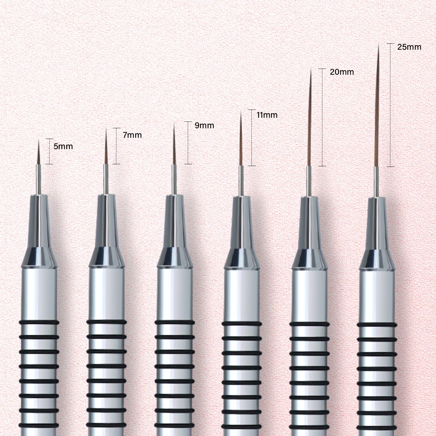 Metallic Nail Art Brushes, 6Pcs Non Slip Liner Brush Set, UV Gel Polish Painting Art Design Pen for Long Lines, Thin Details, Fine Drawing Sizes 5/7/9/11/20/25mm(Silver)
