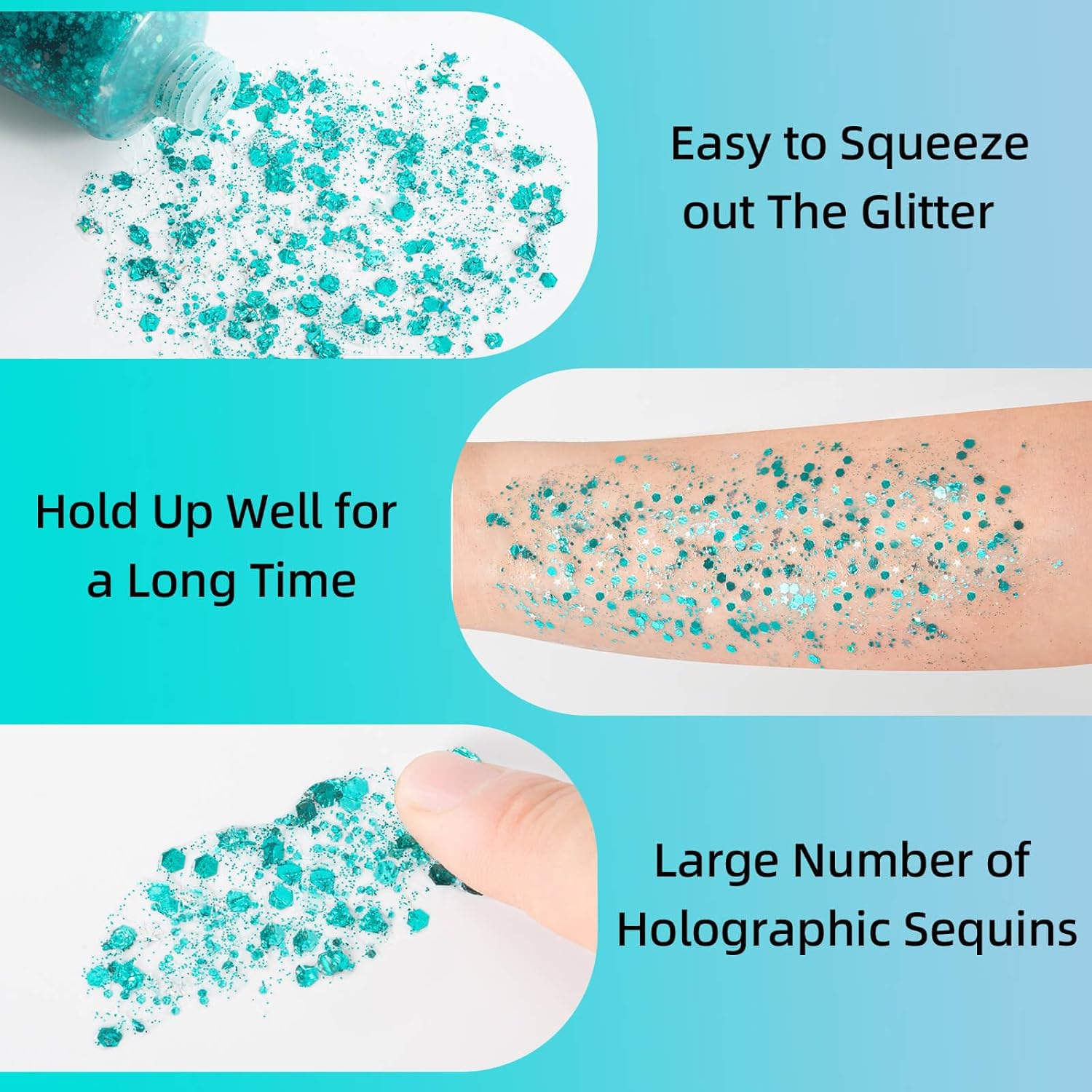 - Natural Safe Ingredients --- The teal glitter for face is infused with safe formula,hypoallergenic ingredients,non-irritating on the skin,you do not have to worry about glue irritating your skin,gel of the glitter can protect your skin from sequin.All face glitter formulated with non toxic material,safety body glitter for kids