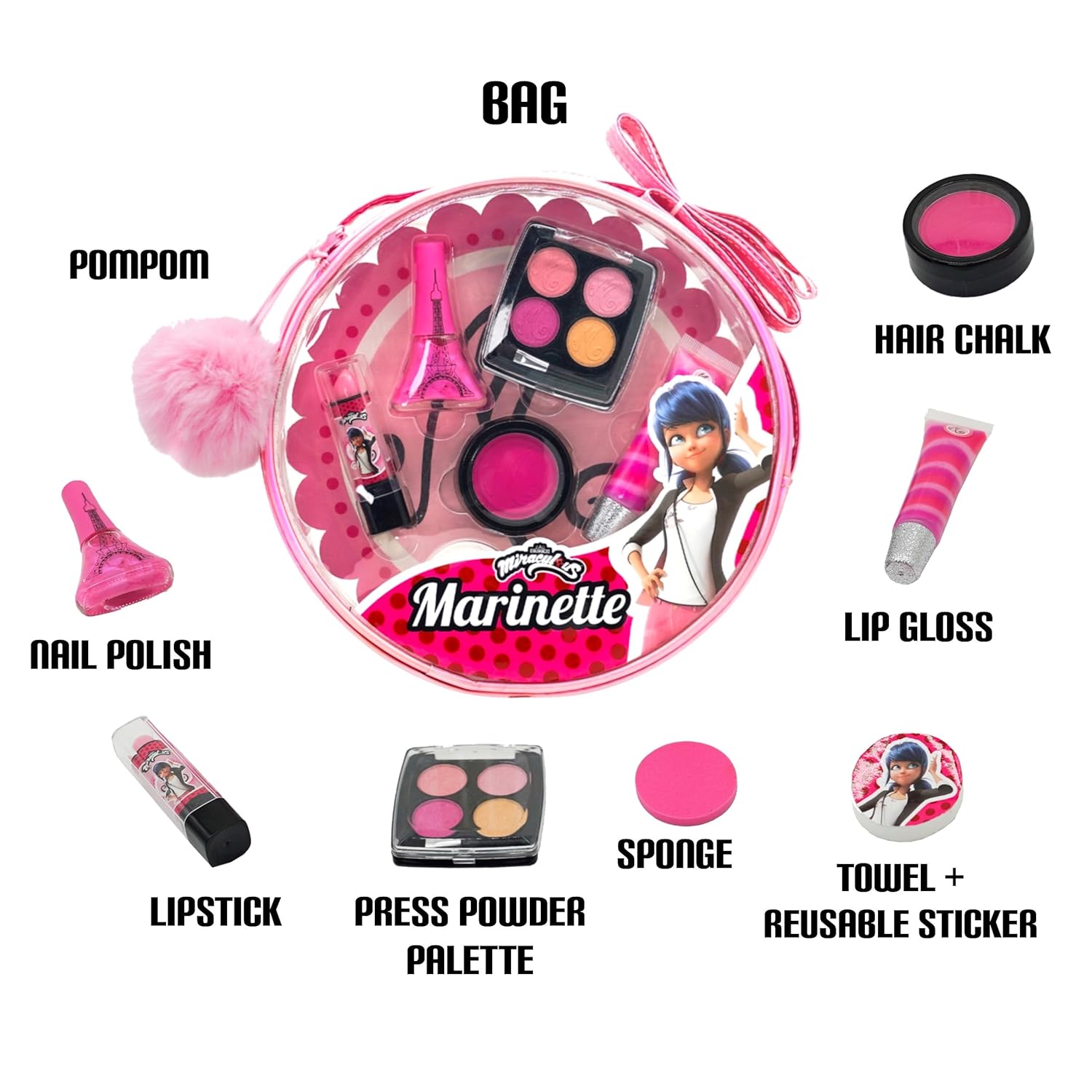 Miraculous Ladybug Kids Makeup Set - 10 Piece Bag with Nail Polish, Hair Chalk, Stickers & More - Safe, Non-Toxic Pretend Play Cosmetics - Marinette Themed Makeup Kit for Children