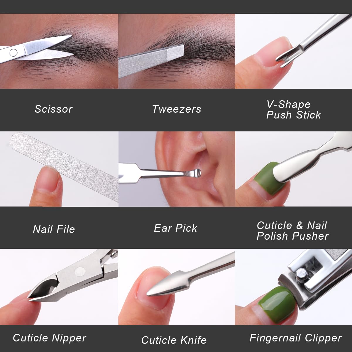 - 【FAMILIFE 11Pcs Manicure Kit】 FAMILIFE stainless steel manicure tools kit concludes 11 tools, 1x Fingernail Clipper, 1x Toenail Clipper, 1x Cuticle Nipper, 1x Obtuse Push Broach, 1X Nail File, 1x Eyebrow Tweezers, 1x V-Shape Push Stick, 1x Ingrown Toenail Clipper, 1xBeauty Scissors, 1xCuticle Knife, 1xEar Pick, equipped with mens manicure pedicure set care tools for hands, feet, and face. And a portable black leather case is included which is easy for you to take out.