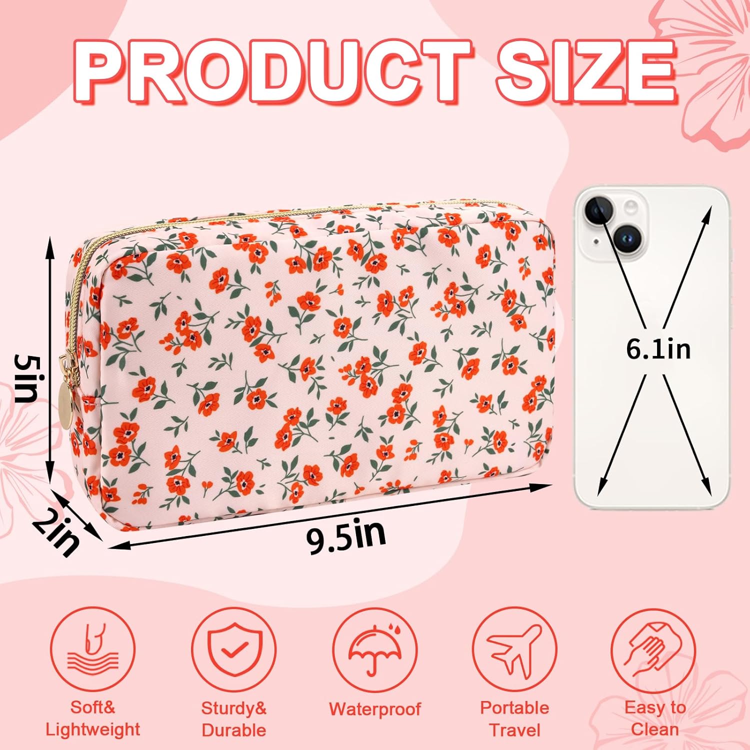 Waterproof Small Floral Makeup Bag Pouch for Purse,Nylon Flower Cosmetic Bag Preppy Travel Toiletry Storage Bag for Women Girl,Cute Makeup Organizer Bag Skincare Bag with Zipper(Small Pink-Flowers)